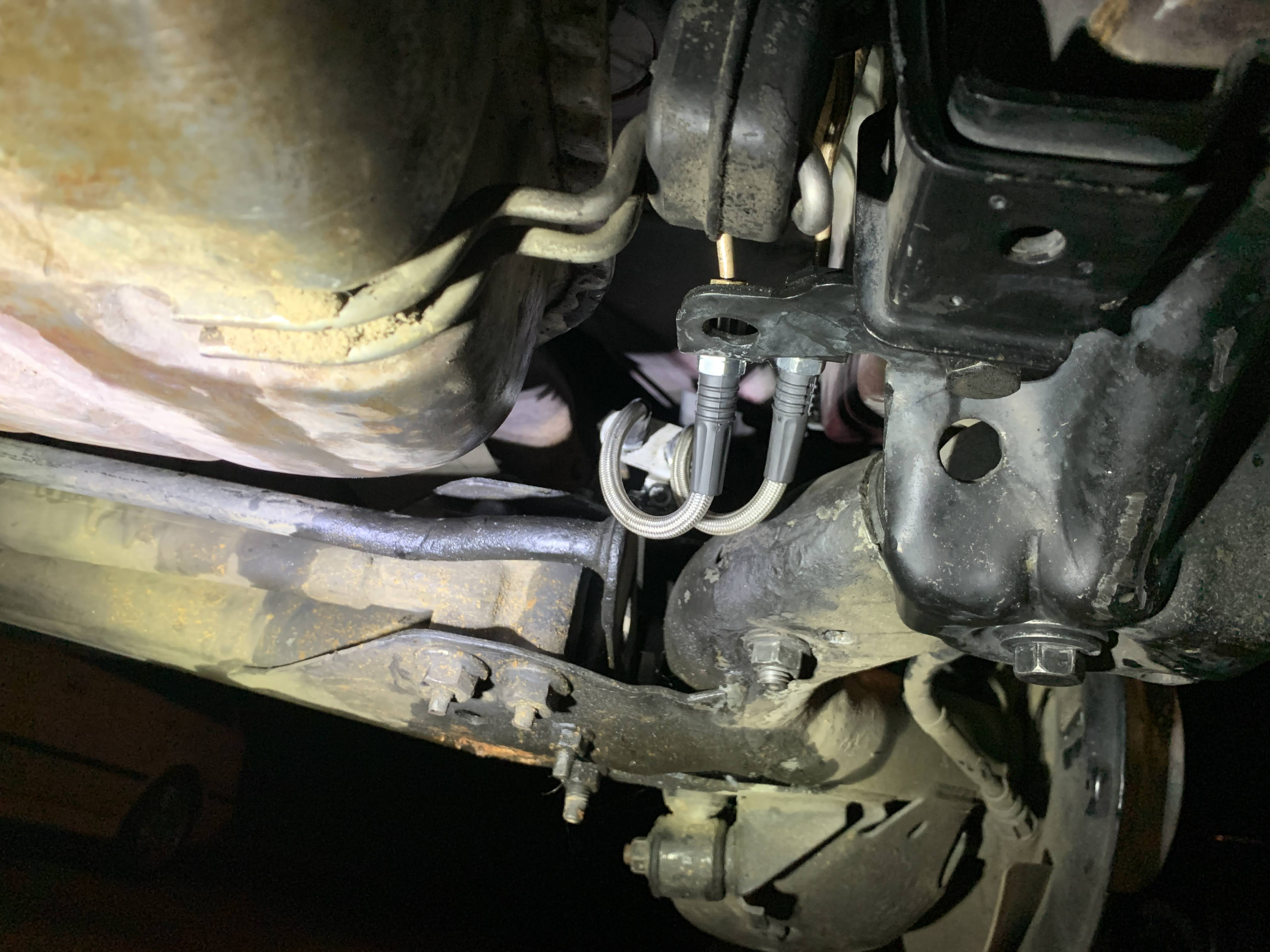 I took the opportunity to replace the old stiff rubber brake hoses with stainless ones. I had to cut back and re-flare the driver side line, since I had just use a union to keep a hard brake line to that side when I did the FWD suspension swap. I prefer to have a flexible line somewhere in the area to allow for suspension movement!