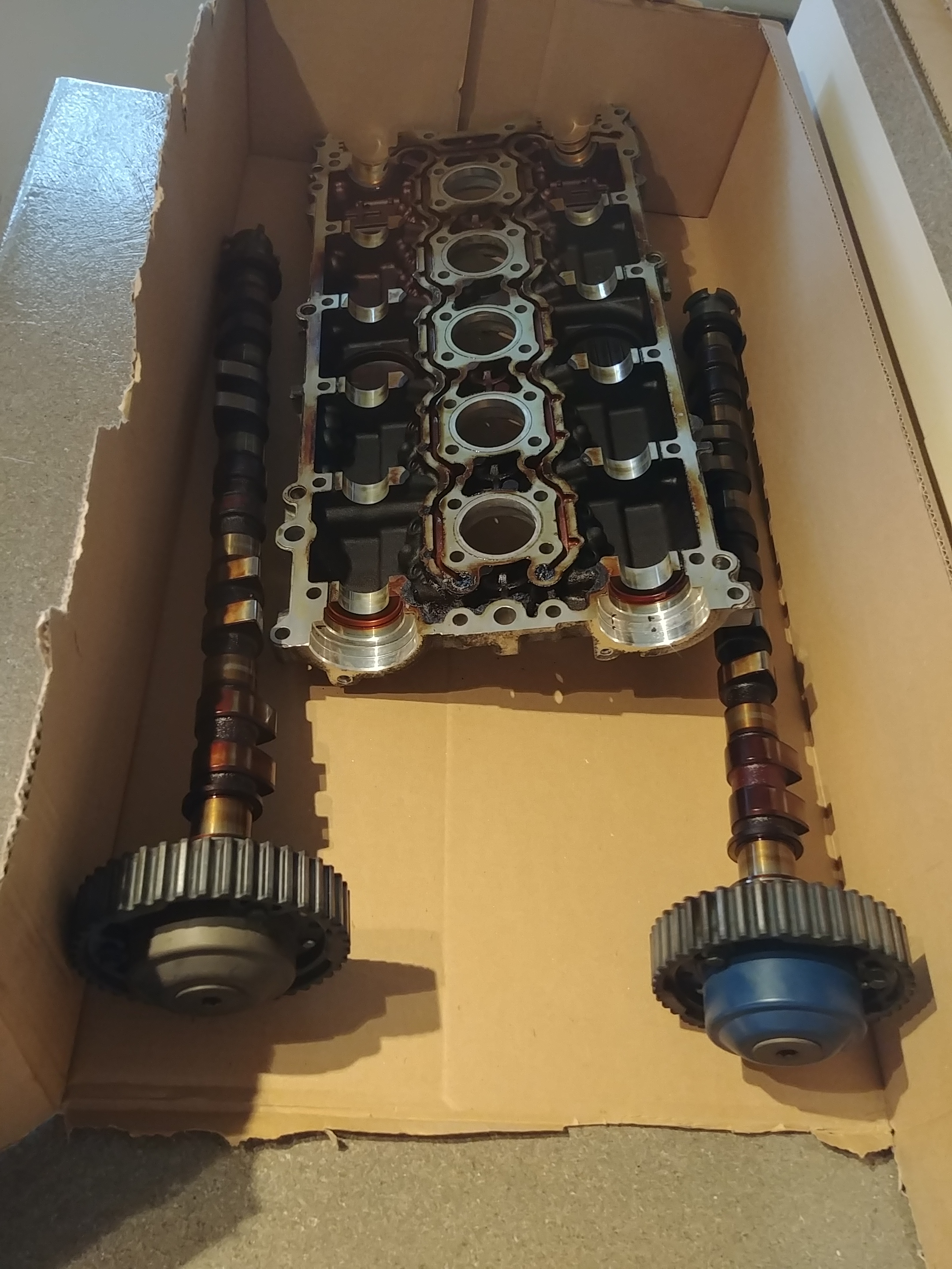 Either way, protect the camshafts from banging against the head and each other. Putting all three parts in a big cardboard box is a sure way to damage something if they roll around.