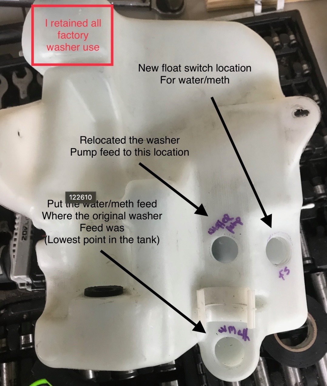 years. This is how I used the OEM washer tank which is approx. 1.7 gal. You will need to drill 2 new holes in the tank....One for where the OEM washer pump will go, and one for the water/meth float sensor. By relocating the water/meth feed to the OEM washer location this will place the water/meth feed at the lowest point in the tank and will also help protect against"sloshing" of the fluid during hard acceleration. By placing the water/meth float switch 2.5"-3" above the bottom of the tank, (just below the OEM low washer fluid float switch) you will leave yourself a "reserve" quantity of water/meth solution when the in cabin LED low fluid light comes on. You will get a low washer fluid indicator prior to the water/meth low fluid light. (essentially giving yourself 2 redundant safety low fluid warnings) Doing this will dump boost back to gate pressure. The car will drive on gate pressure until you turn the key off for a couple minutes to reset the trigger.
