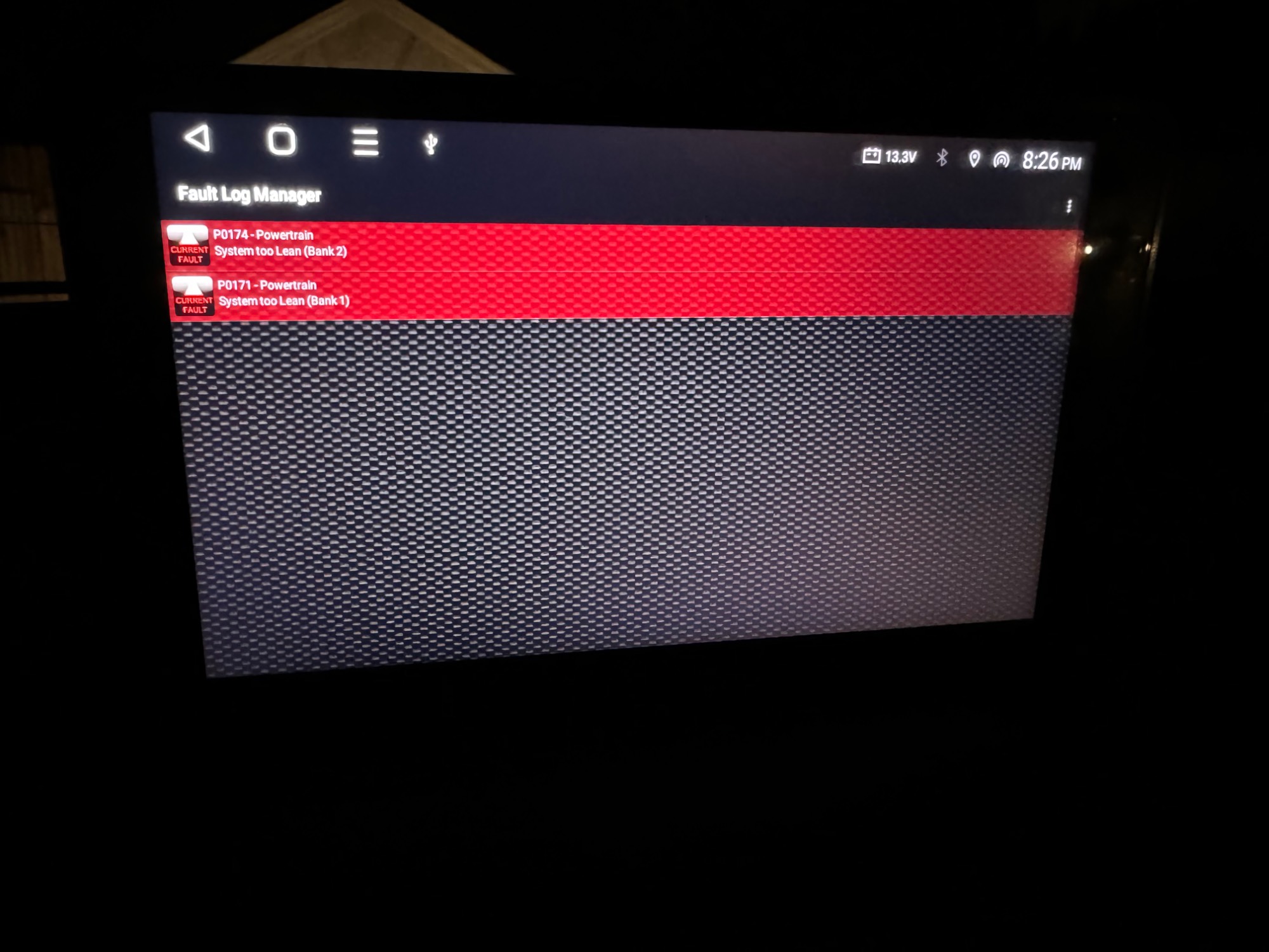 So far the only thing that has appeared is the p0171&p0174 first the 174 then about 10 minutes later on a recheck (without clearing the codes) both 171&174