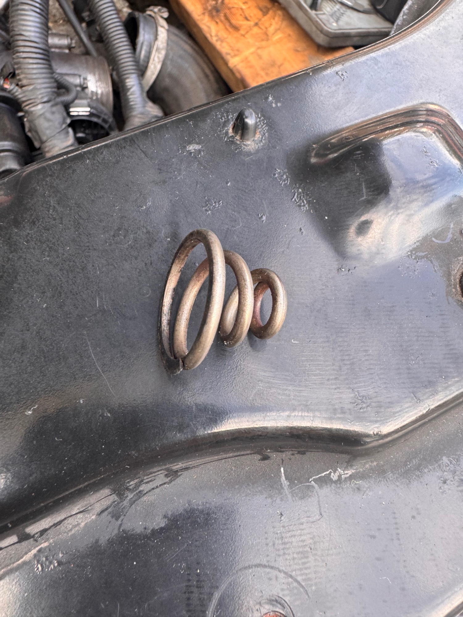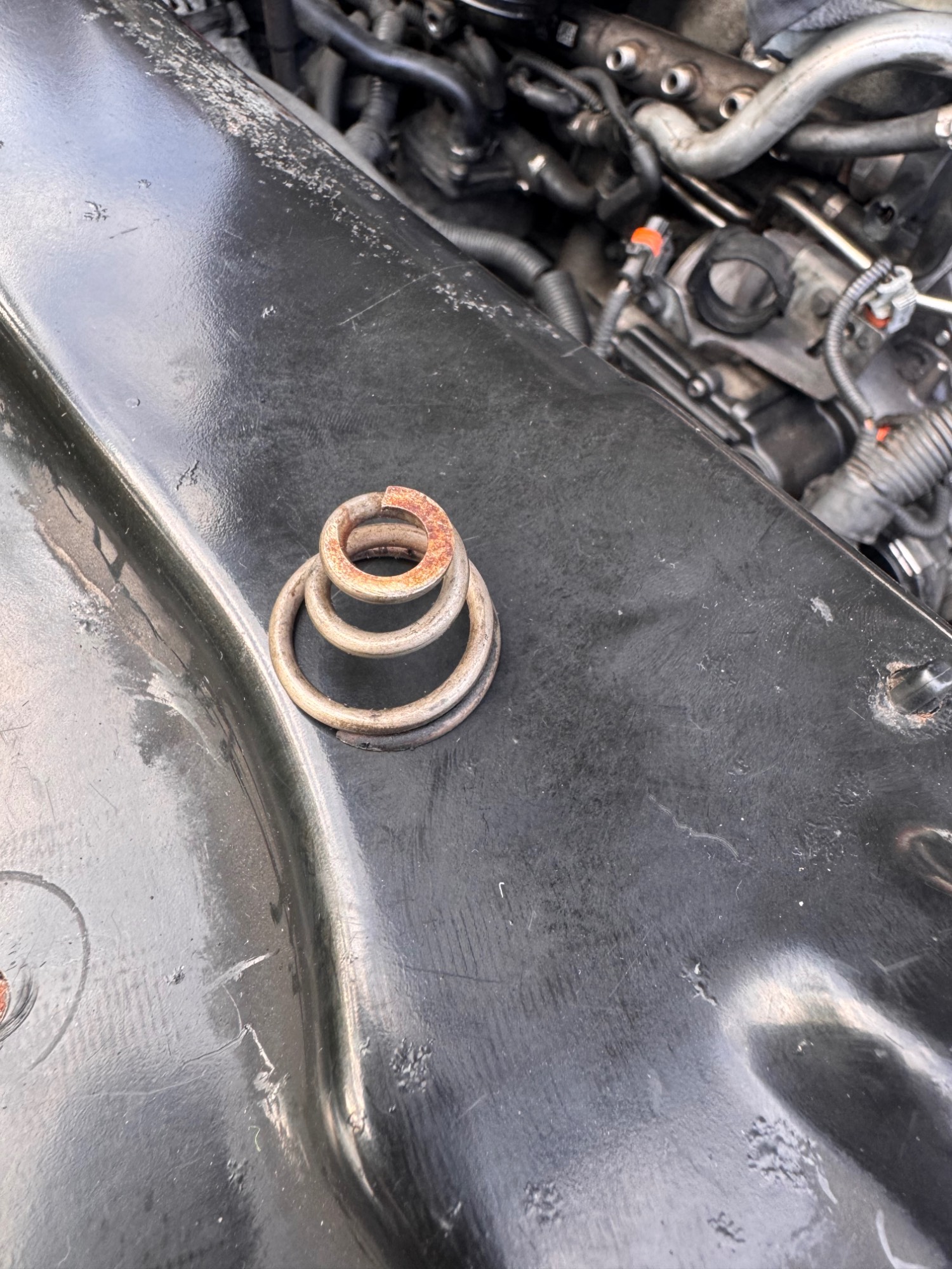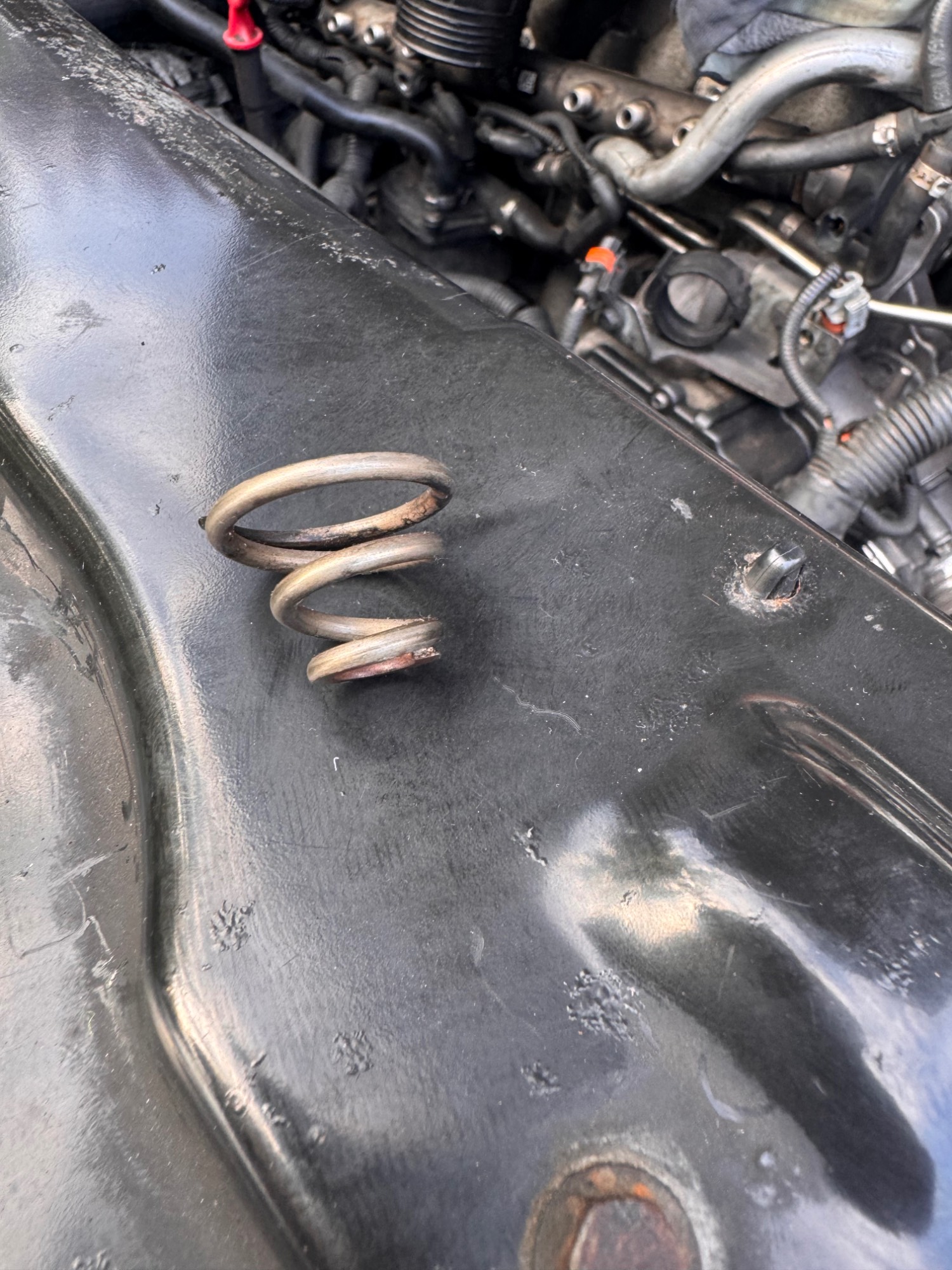 However, it may be a spring for one of the bolts holding a heat shield in place on the exhaust manifold to stop it rattling.