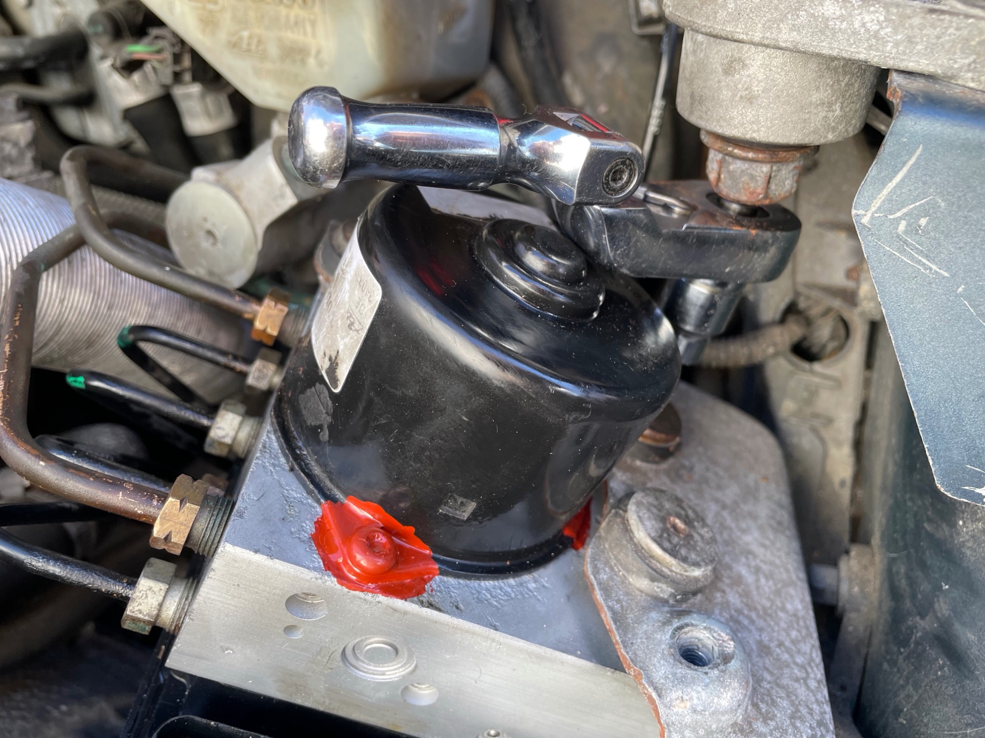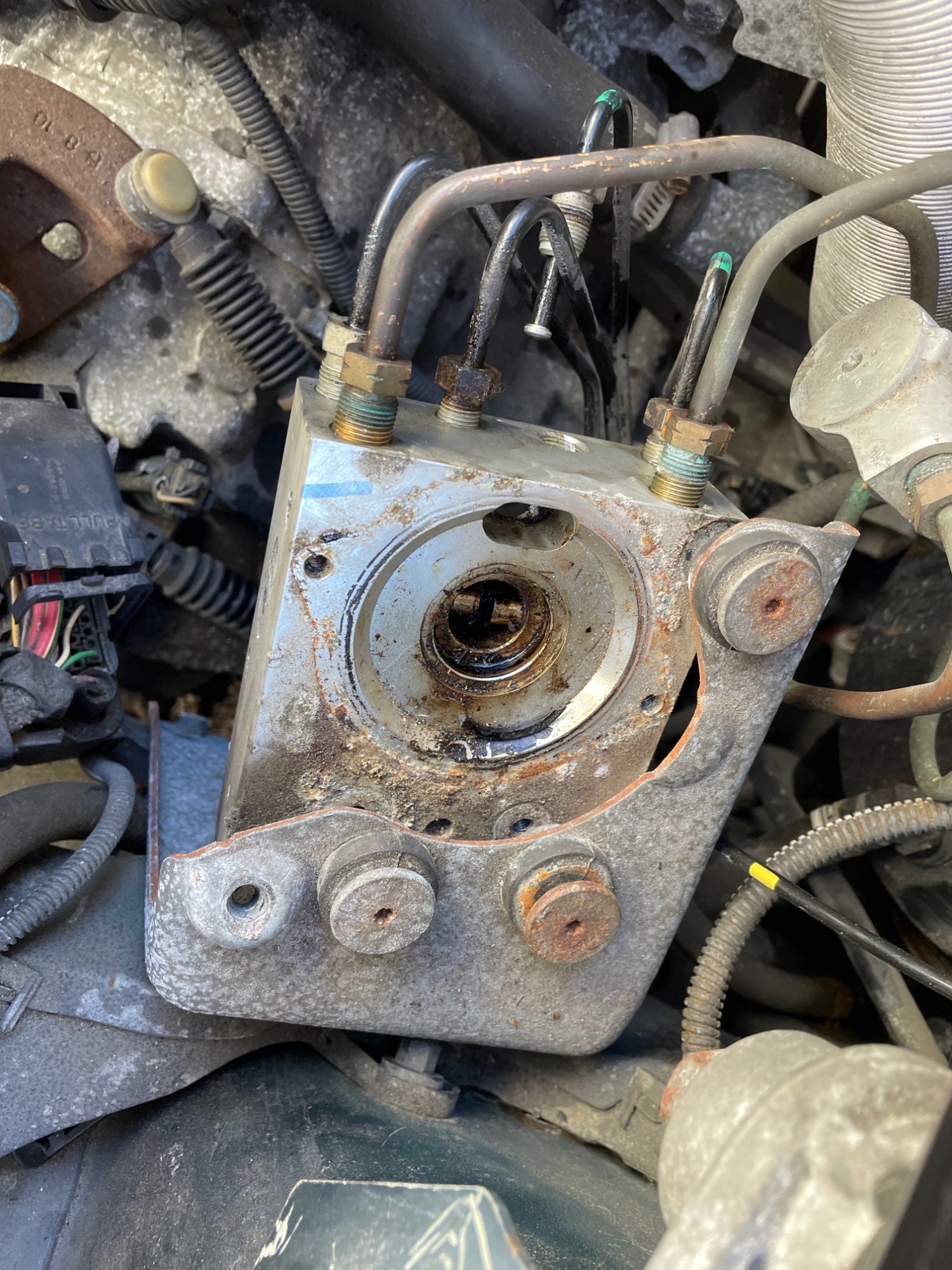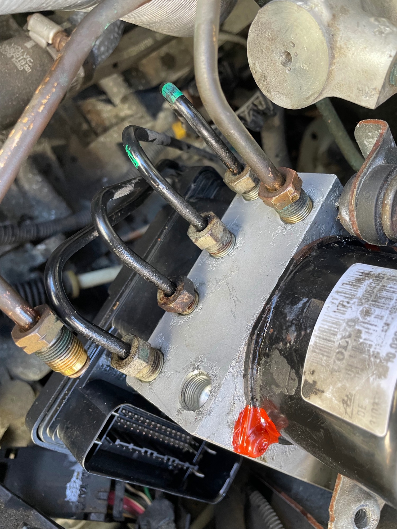 Job hint. Just start two of the t27 bolts holding the block to the metal frame. It’s always easier to thread brake nut flares when both pieces can move, I’ve observed. Handthread a couple of turns so you don’t cross thread with a dab of no seize