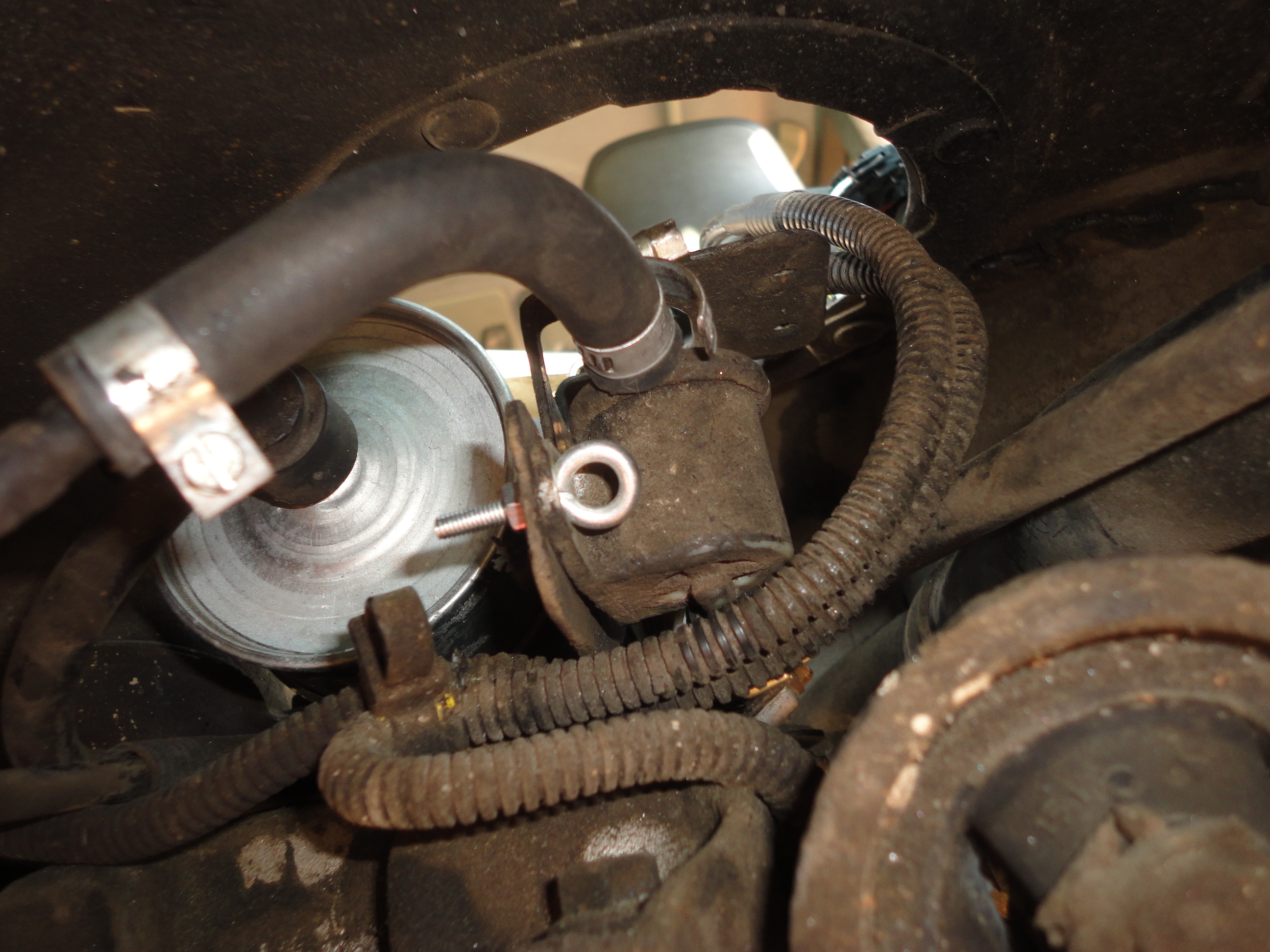 1) I started with the Evap Canister (to the left of the front driver's wheel when looking at the car head on). Use a 10mm wrench to remove the small bolt at the bottom of the canister and drop the canister down. Some folks have talked about removing the fender skirt to gain access, but I didn't find that necessary.