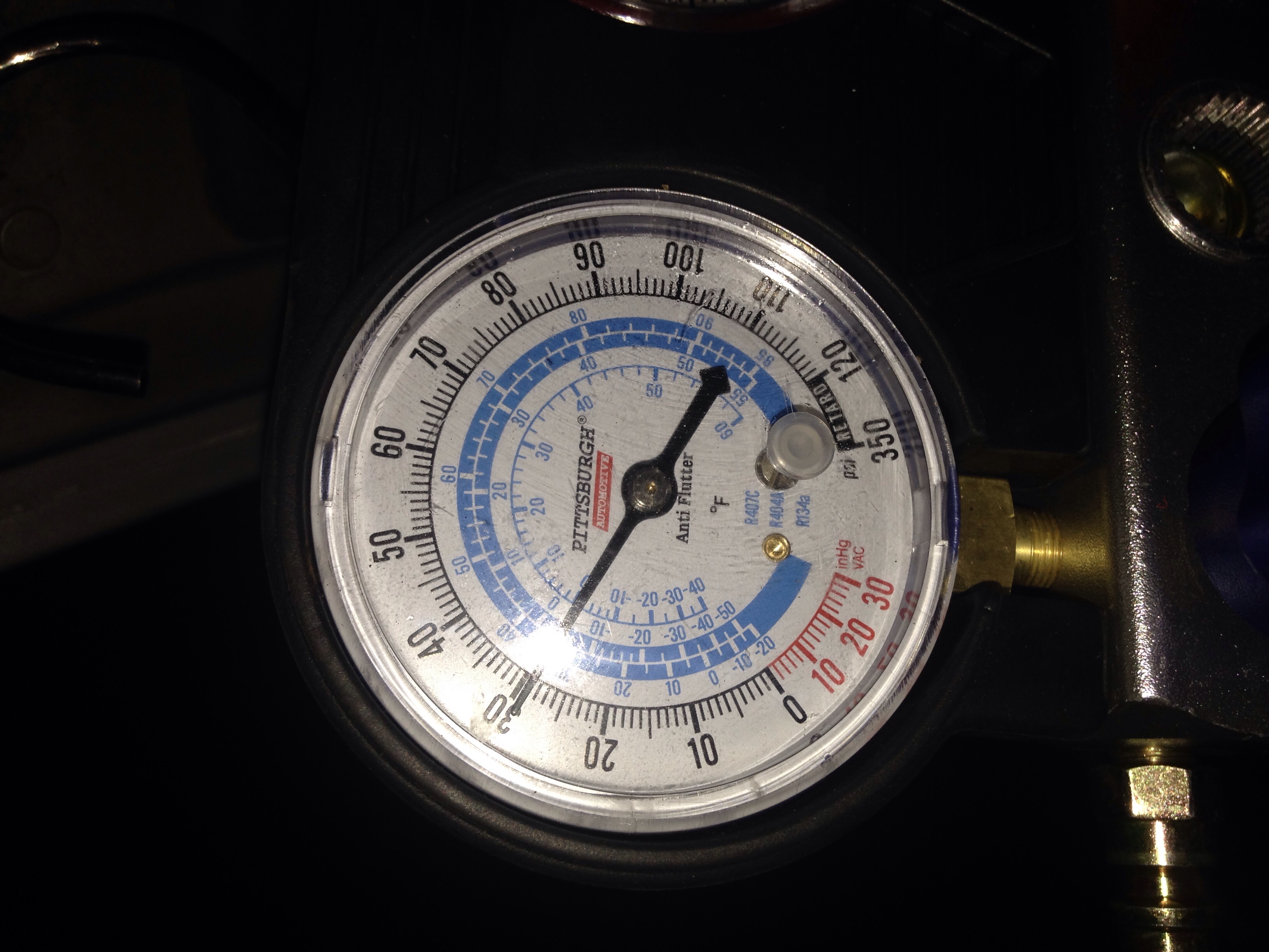 Namely that normal pressure on the low side is about 45 psi at 90 degrees F. Also the engine needs to be revved to 1200+ rpm for accurate measurement, in which case you would likely see the pressure drop below your current gauge reading. So you may have a leak that is causing icing in the evaporator--hence the cold inside reading, but compressor laboring to keep up.