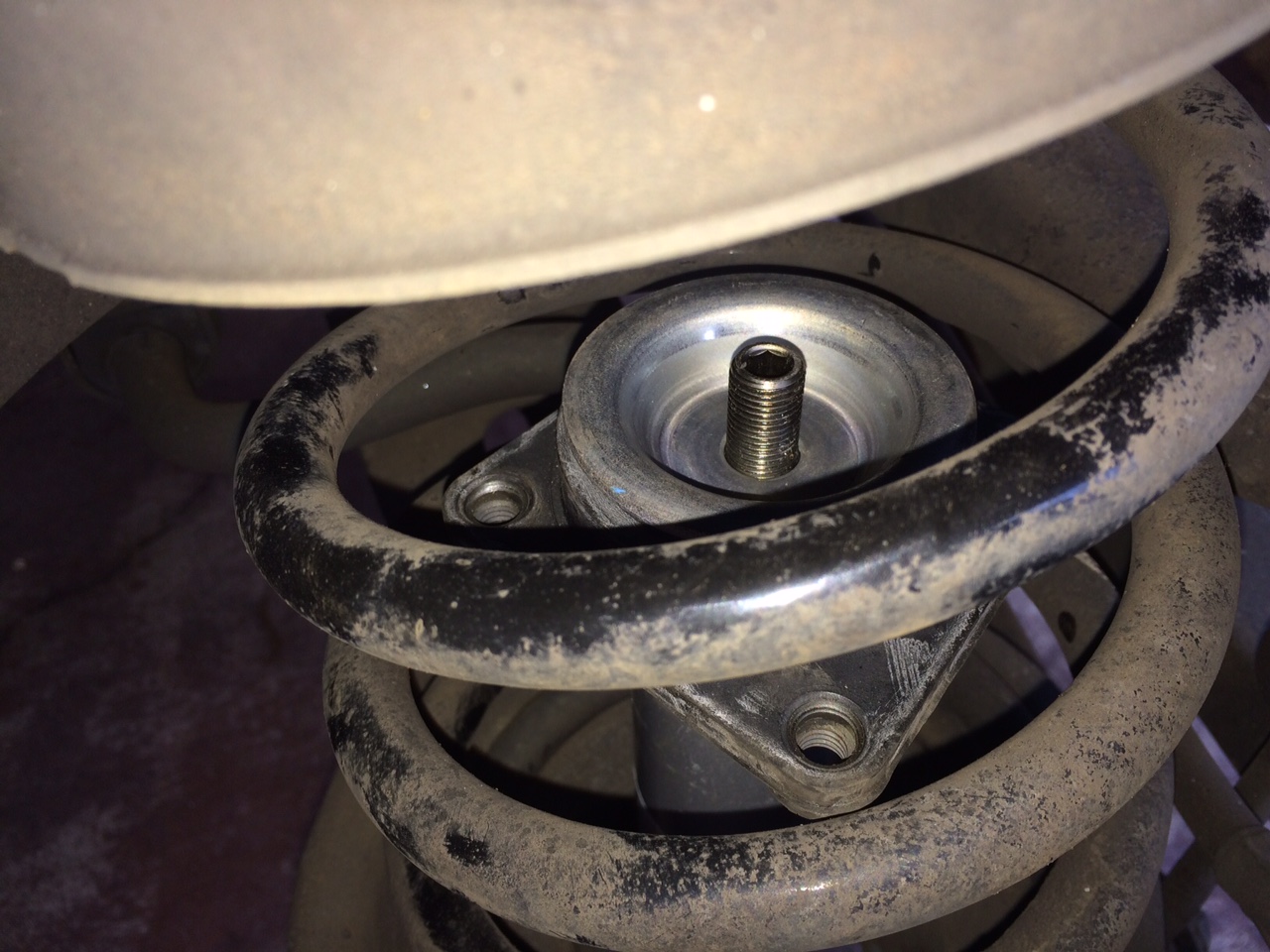 With re-installing the struts, I put the shock top on top of the shock (I'd loosely fit the nut as well) and push it all up inside the spring. This saves a bit of fiddling with doing them separately - especially working on your own.