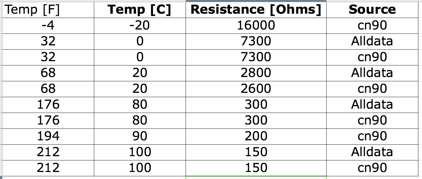 A while back I measured FAE and SWF ECT's for a '97 855 and plotted up the values. The aftermarket FAE had failed and was reading higher across the entire temperature range: