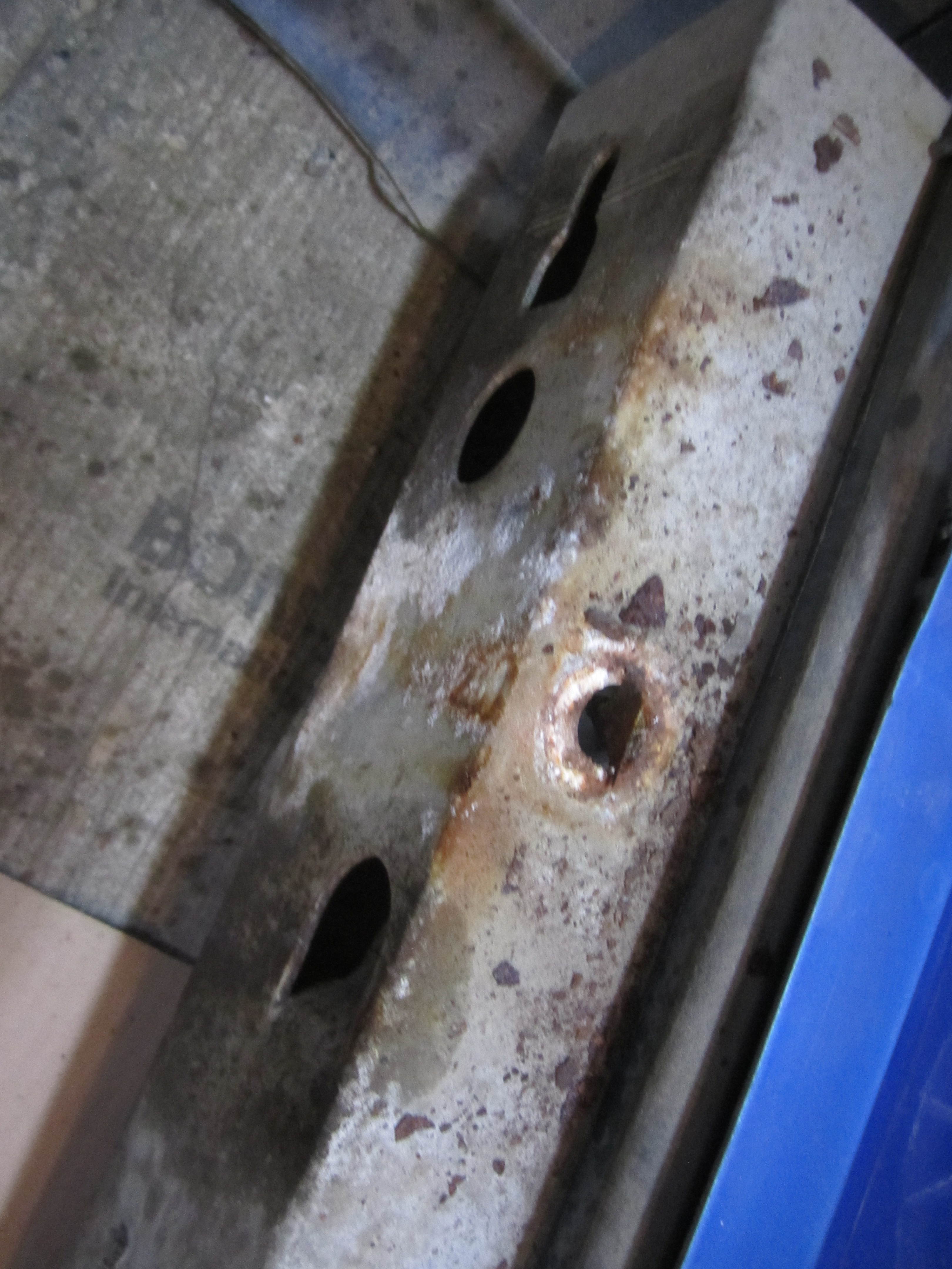 This then gave me room to try to force the broken bracket through bolt to move the bumper out. As the bracket was so rotten, it allowed me to actually move the bumper stiffener out enough to get to the 2 bracket mounting bolts with a 14mm ring wrench. I worked the 2 bolts out a bit at a time and wound them in/out and wire brushed and Deep Creeped them constantly until they eventually came out. I also used the open end of the wrench to get better access.