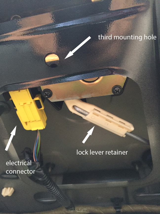 step 6 - once these are unhooked, you can remove the latch up and out of the trunk lid from the inside. In this pic it is sitting in the trunk.