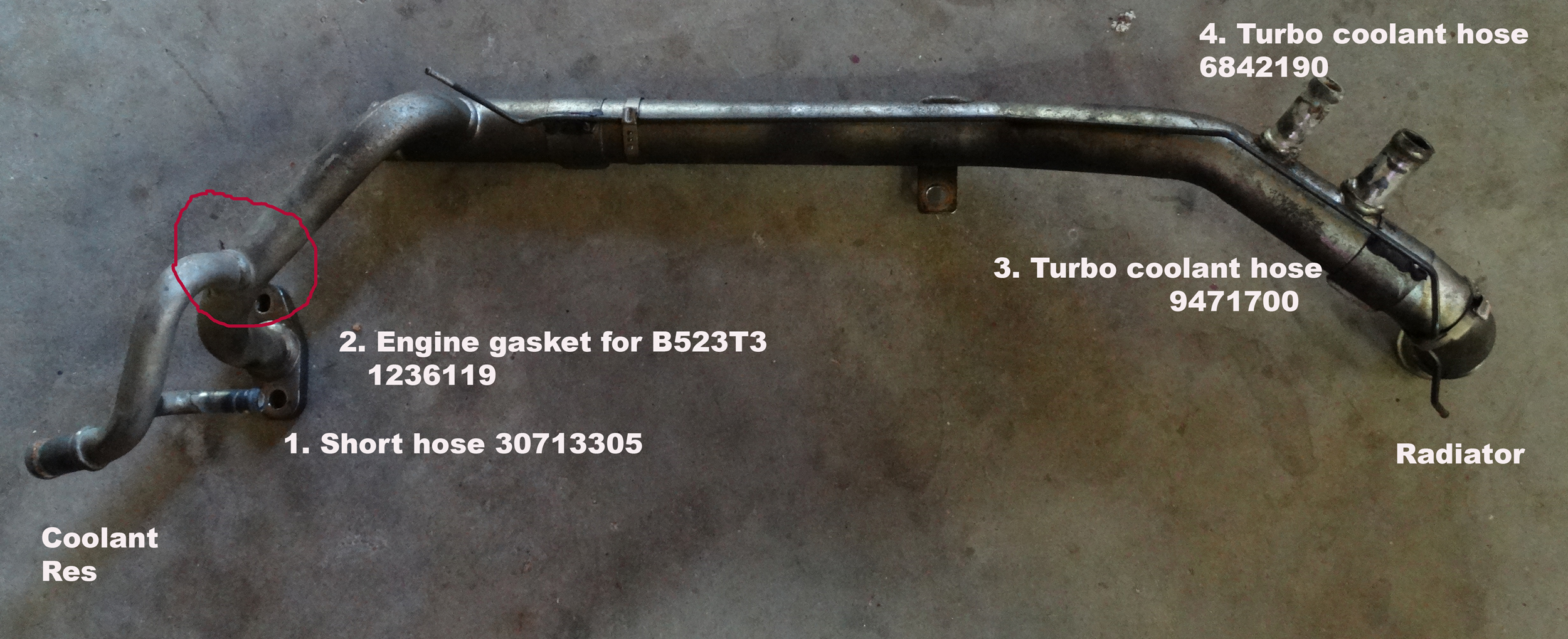 The nipple labeled number 3 is actually the return from the heater core and number 4 is the pipe that comes from the turbo, I personally wouldn't bother using volvo heater hose, the stuff from the auto parts store works just fine to replace those. Same goes for the #1 short hose. I just took the old stuff in and found the same size.