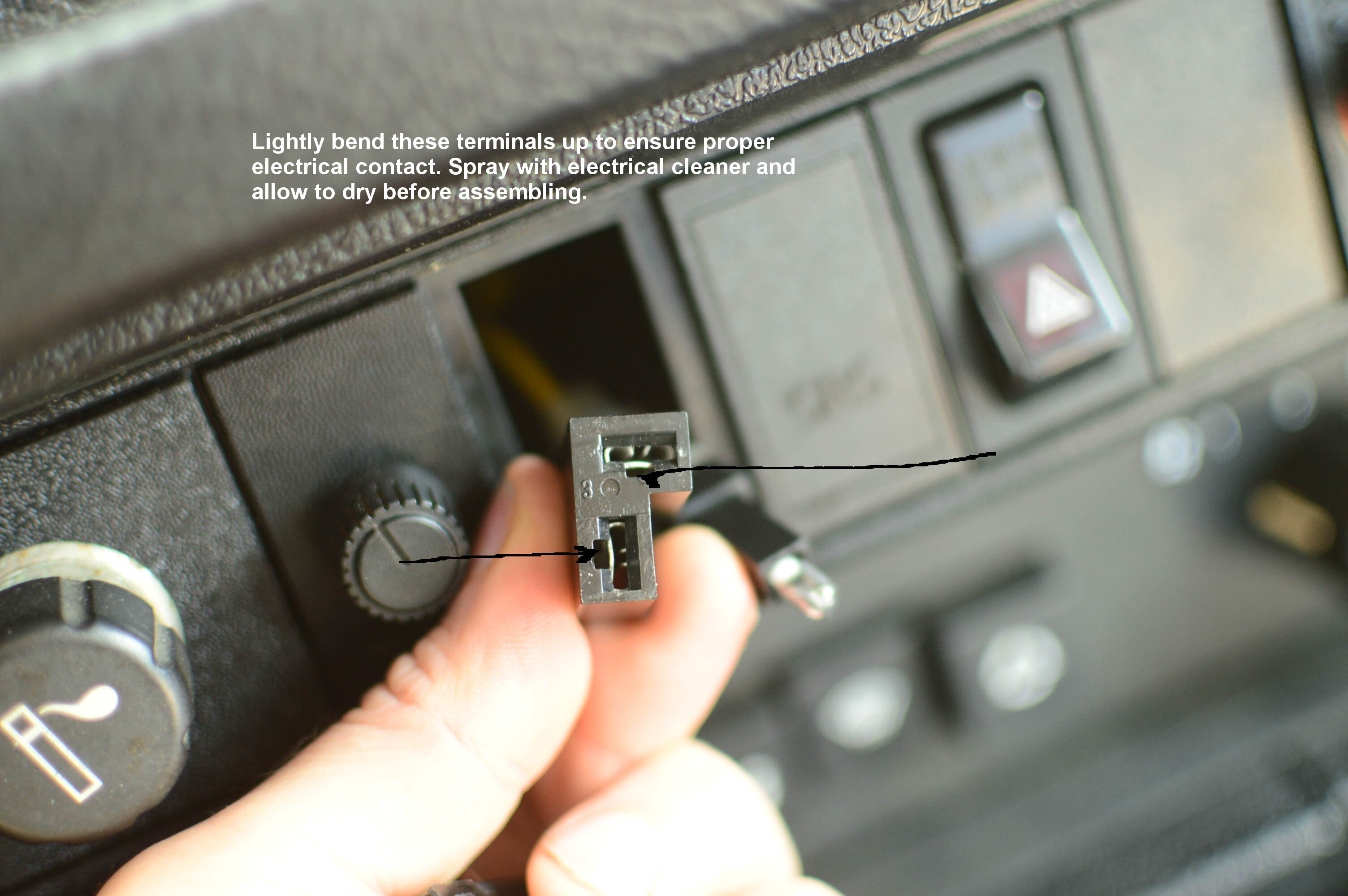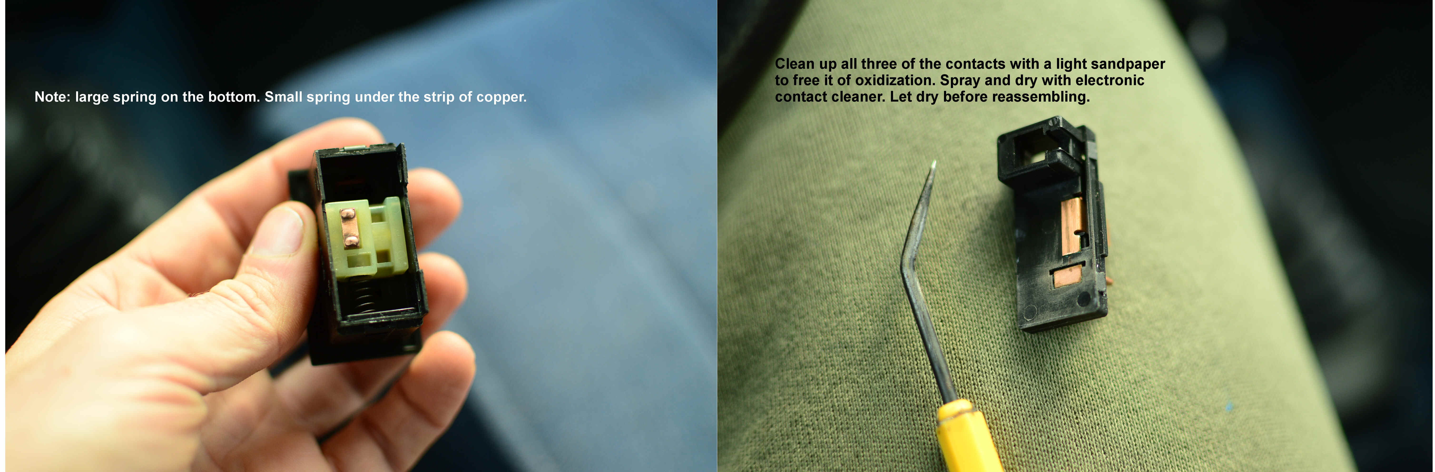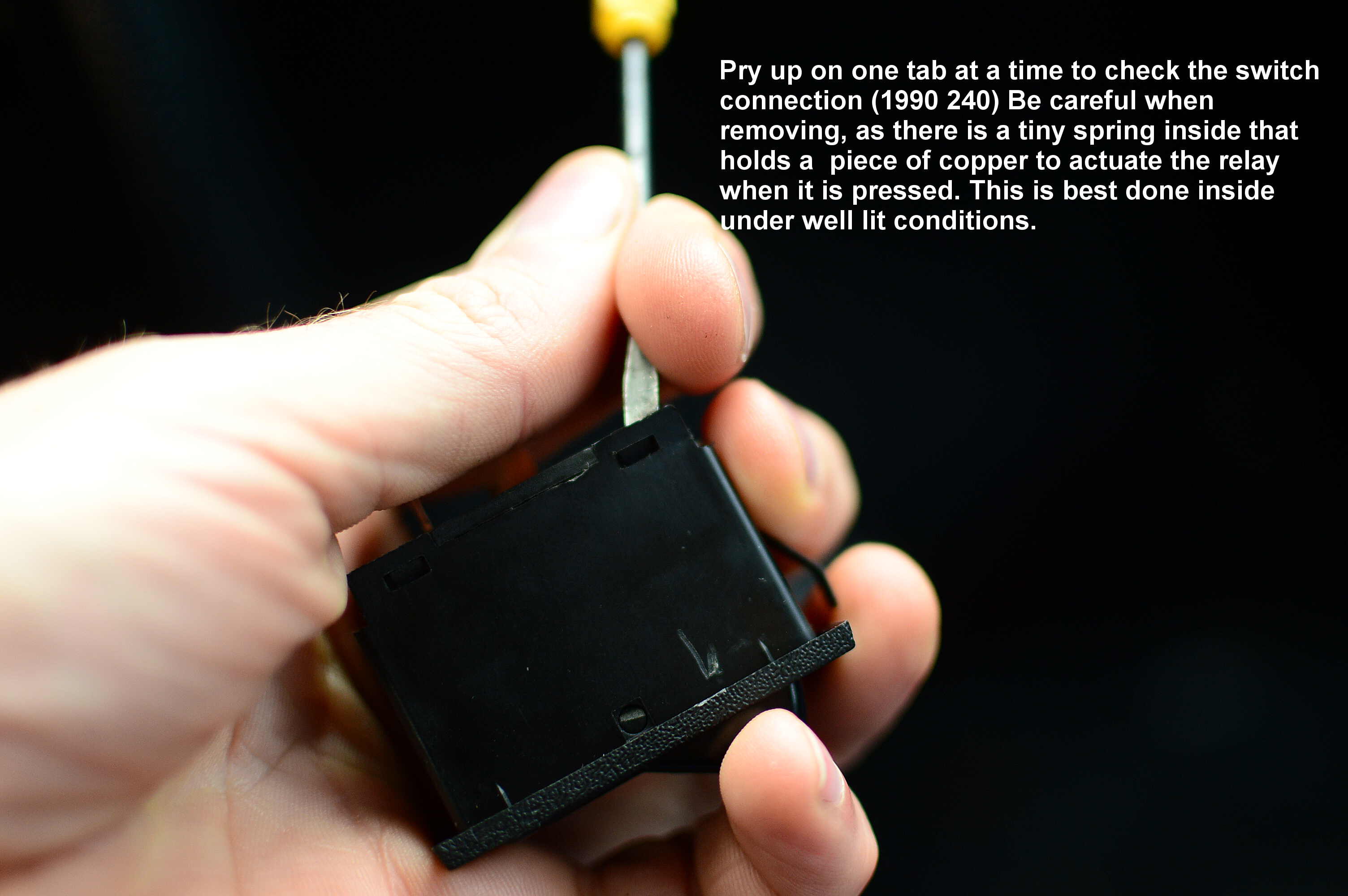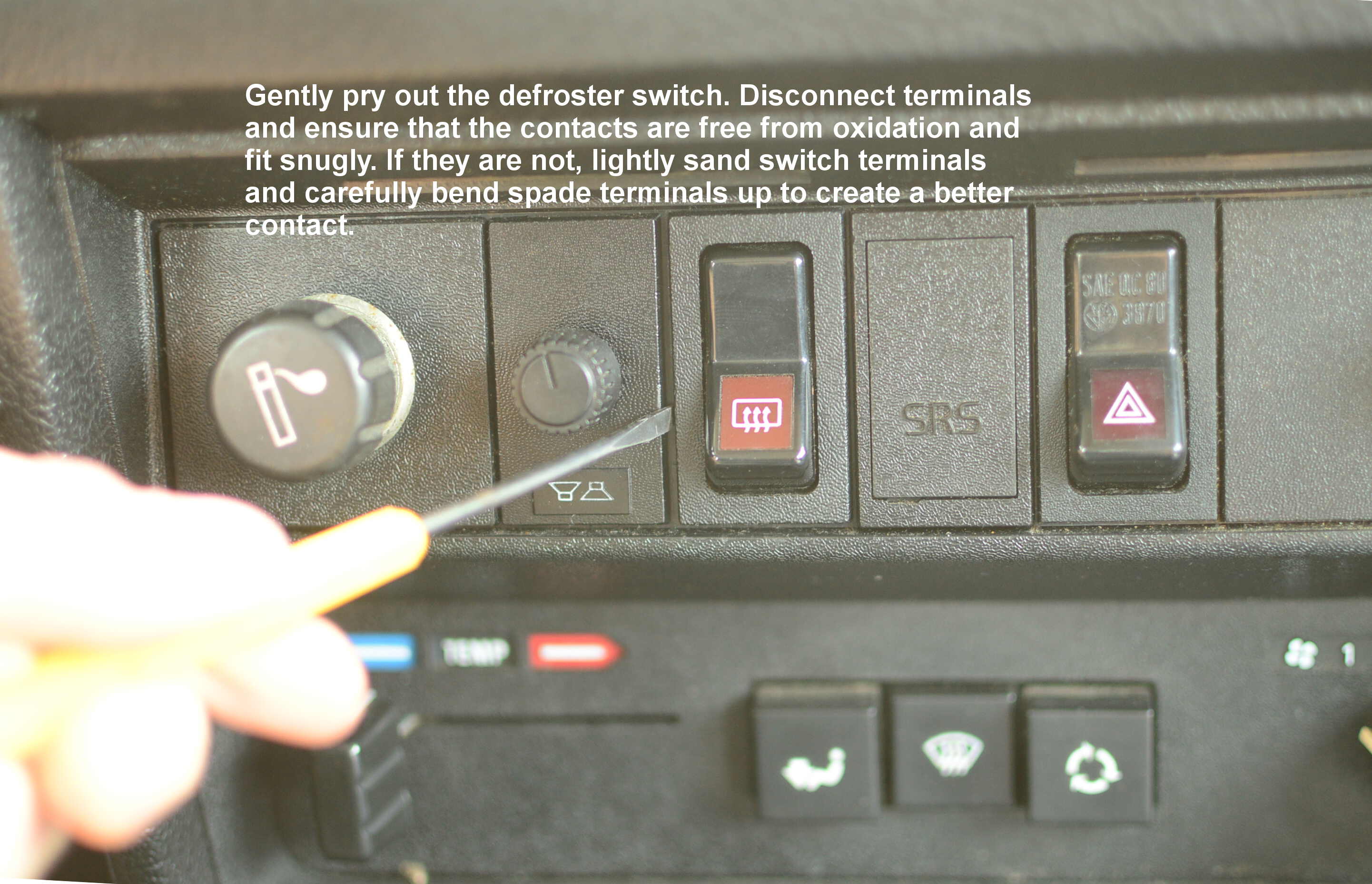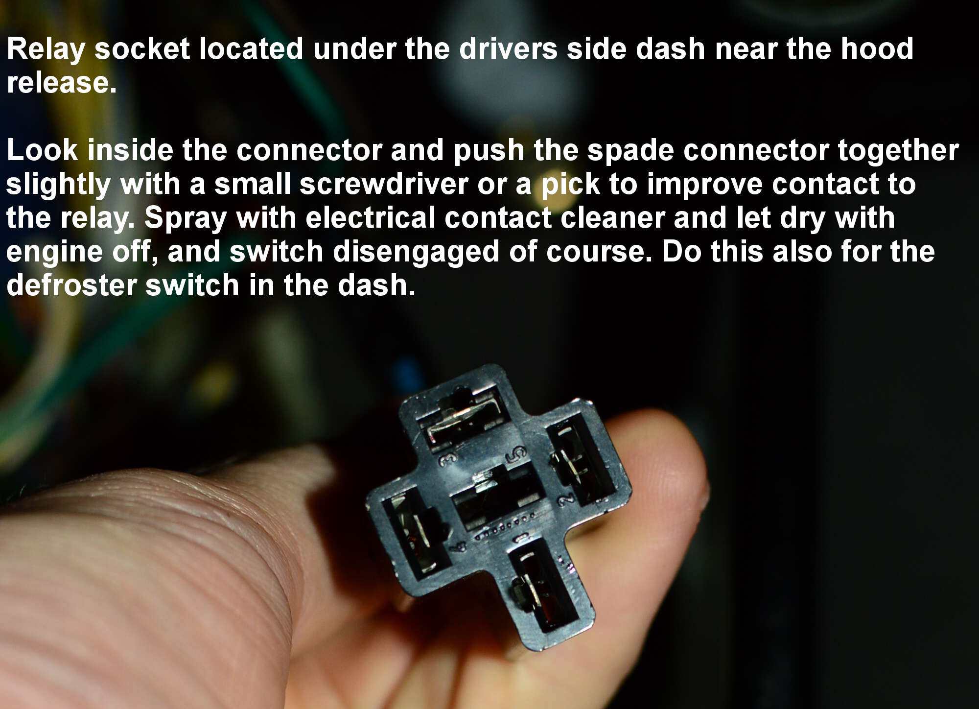Even before this, I did some basic troubleshooting--making sure that the spade terminal connectors snugly fit on both the relay and switch. These were loose, but I still did not hear the click of the relay engaging after this attempt. I even disassembled the defrost button and cleaned the contacts lightly with 180 grit sandpaper and electronic part cleaner. Still no click.