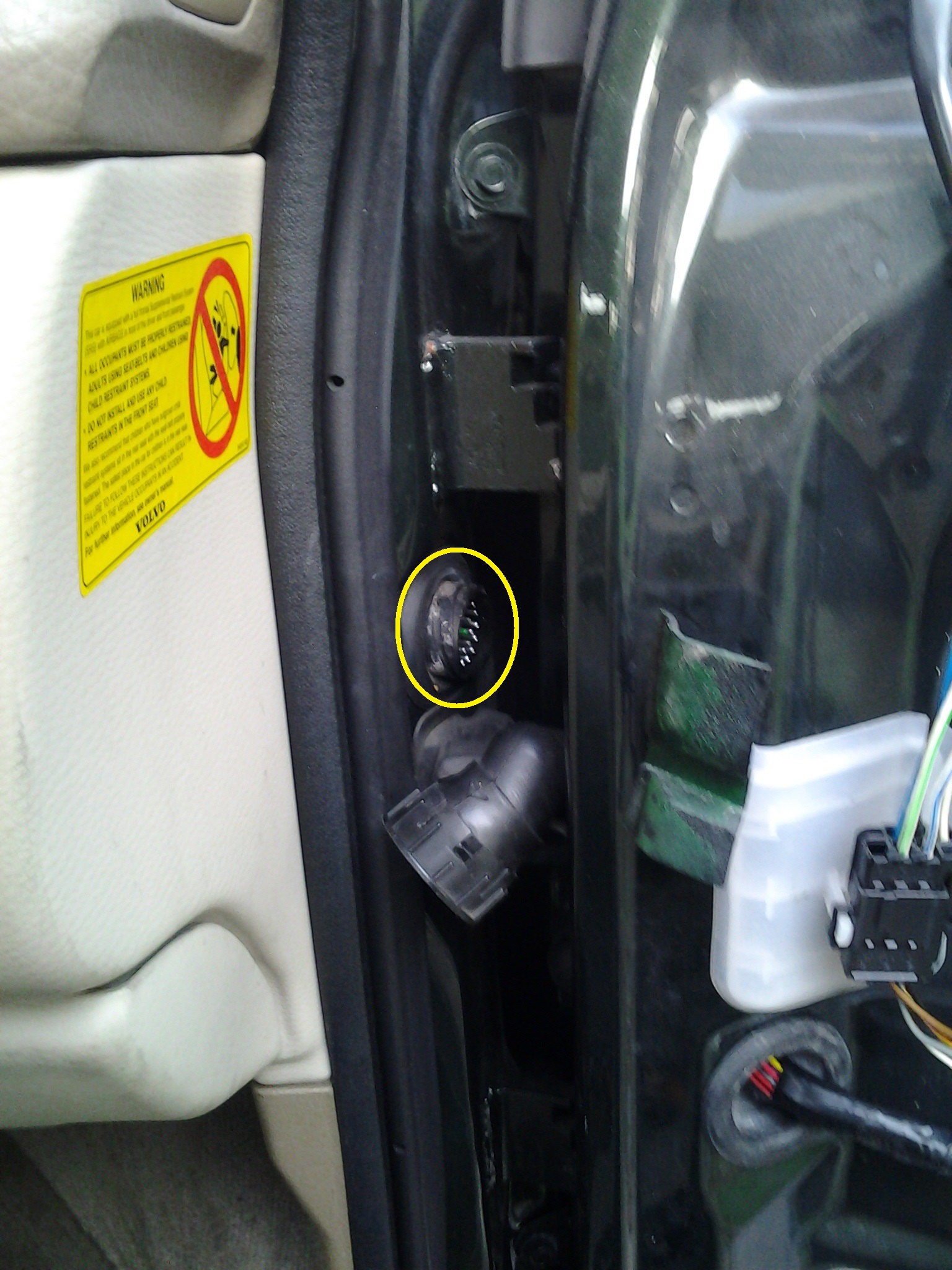 Inside the yellow circle is the male part of the door jamb connector. Those little pins arranged in concentric circles are what I inspected for damage, before moving on to the individual wires leading into the doors.