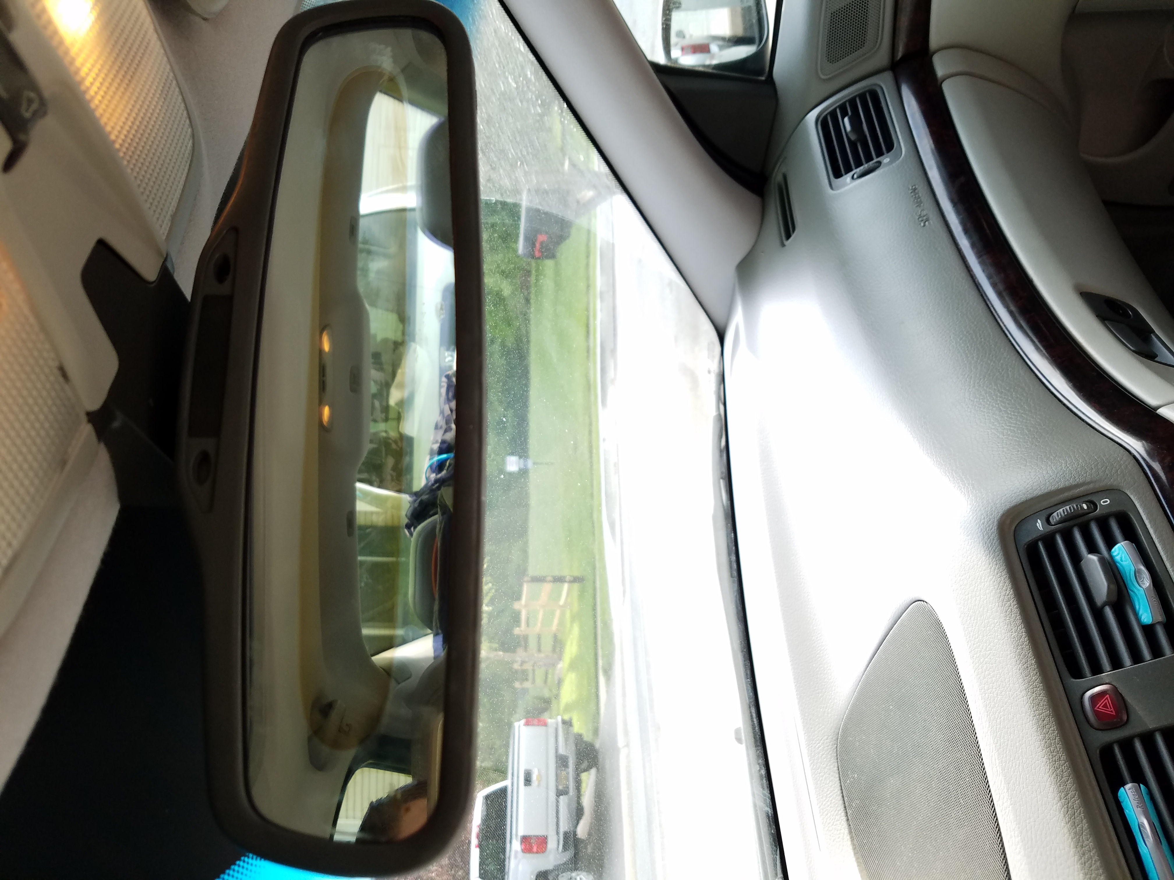 the middle is clear and darker oval shaped, but the edges show double vision and are pretty blurry. it seems to be a two way mirror of sorts, but looks to be busted to me. i googled rear views, and didnt see anything of this sort. also i dont notice any auto dimming, but i have never seen a functional dimming rear view so idk. i tried clean both the front and rear photocells and made no improvement.
