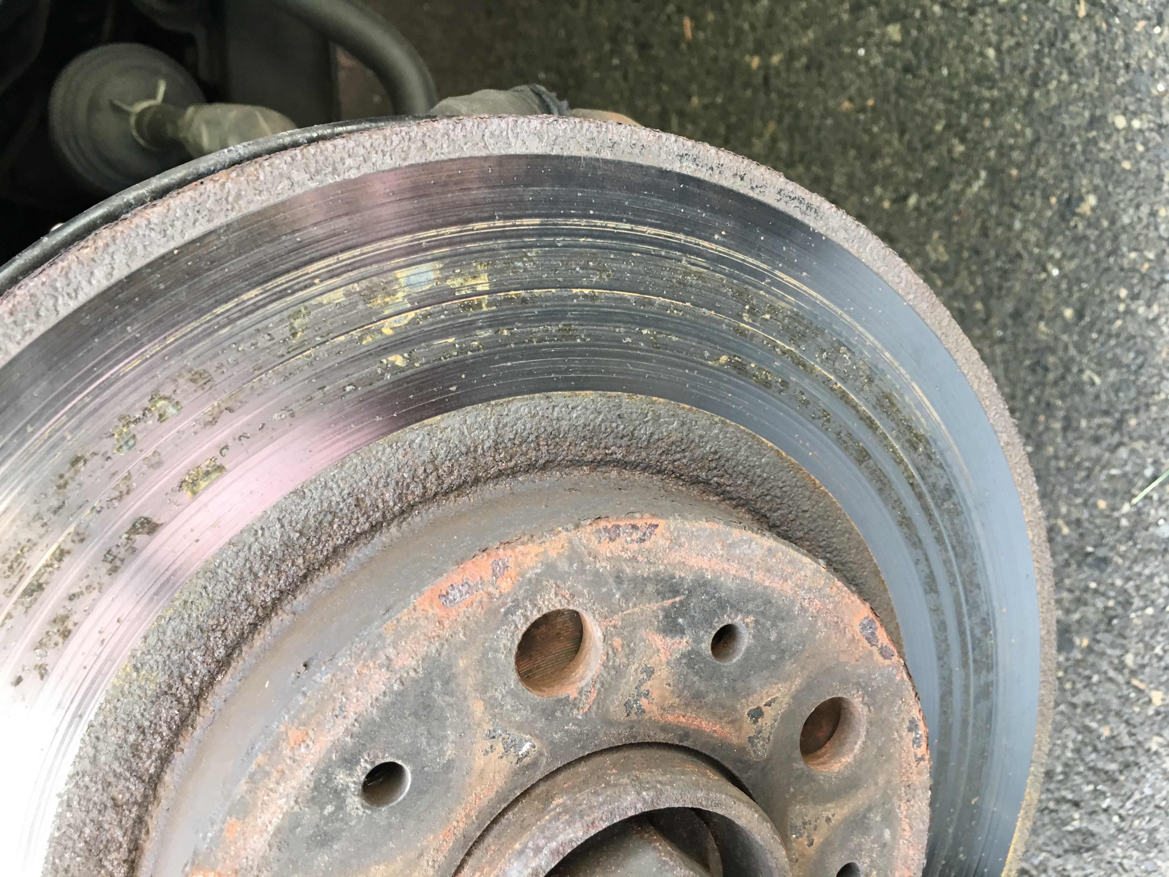 How long have you owned the car? Looks like a previous owner might have ground down to bare metal, then just thrown a pair of cheap pads on the car to get it sold.