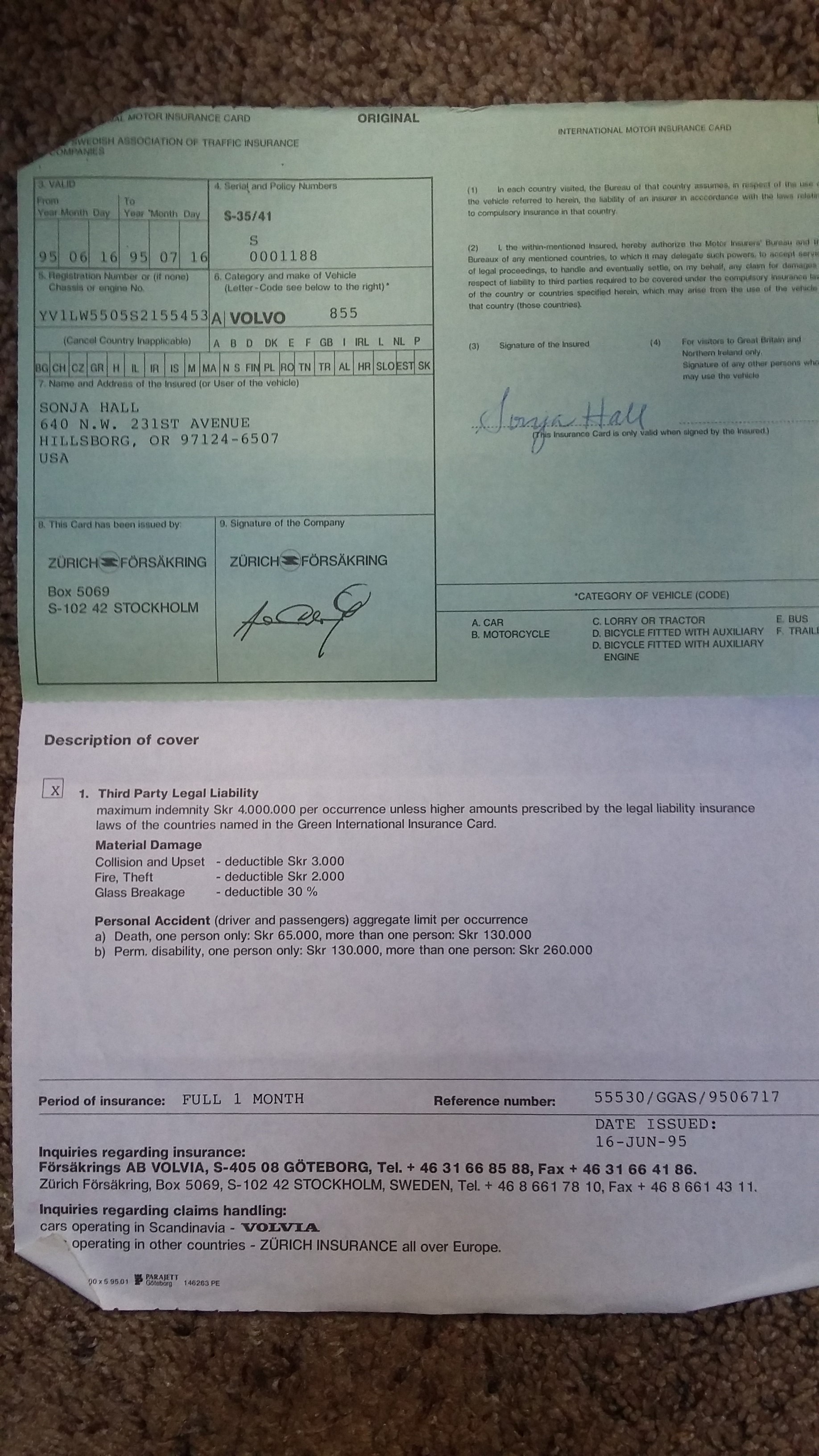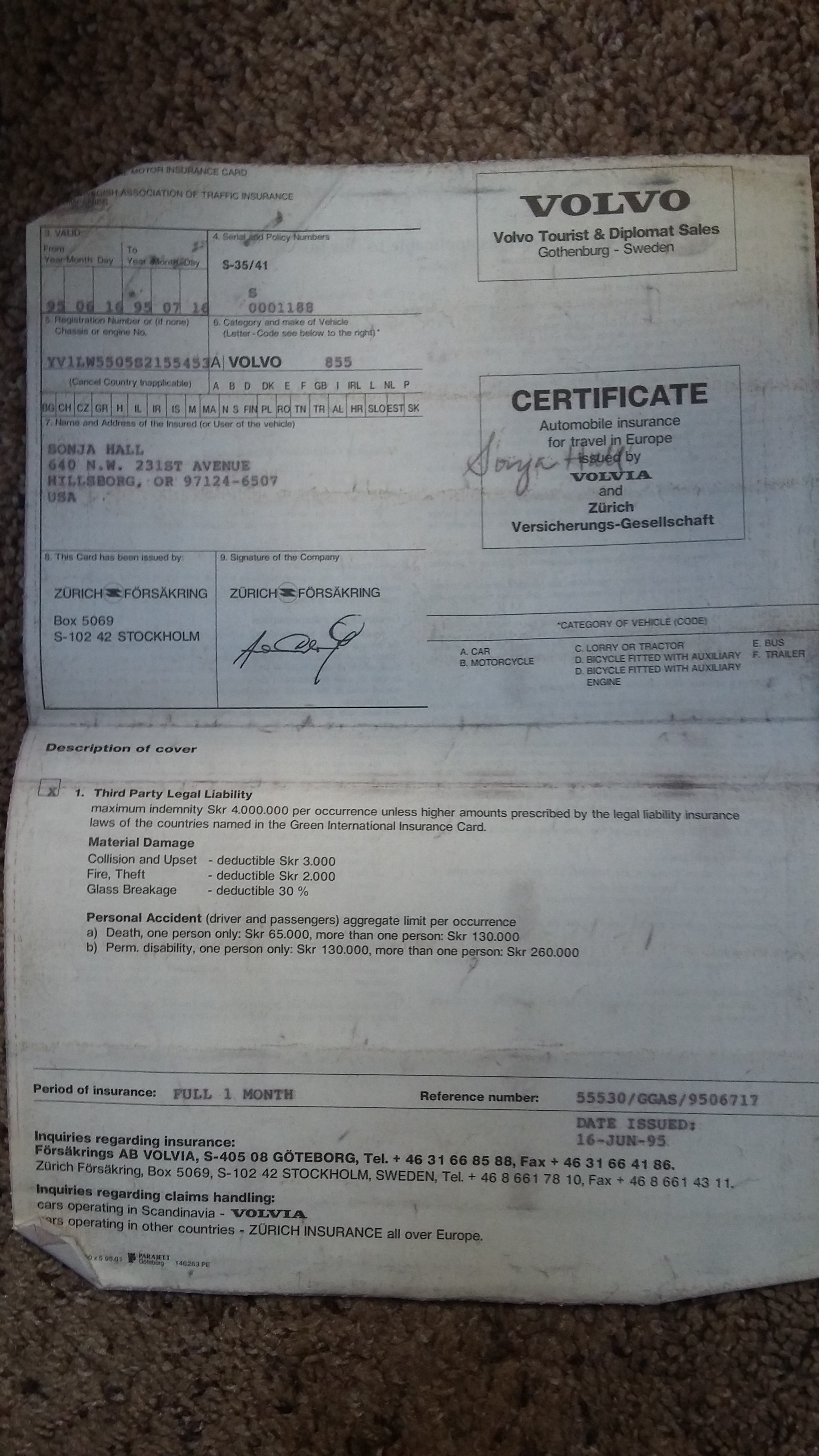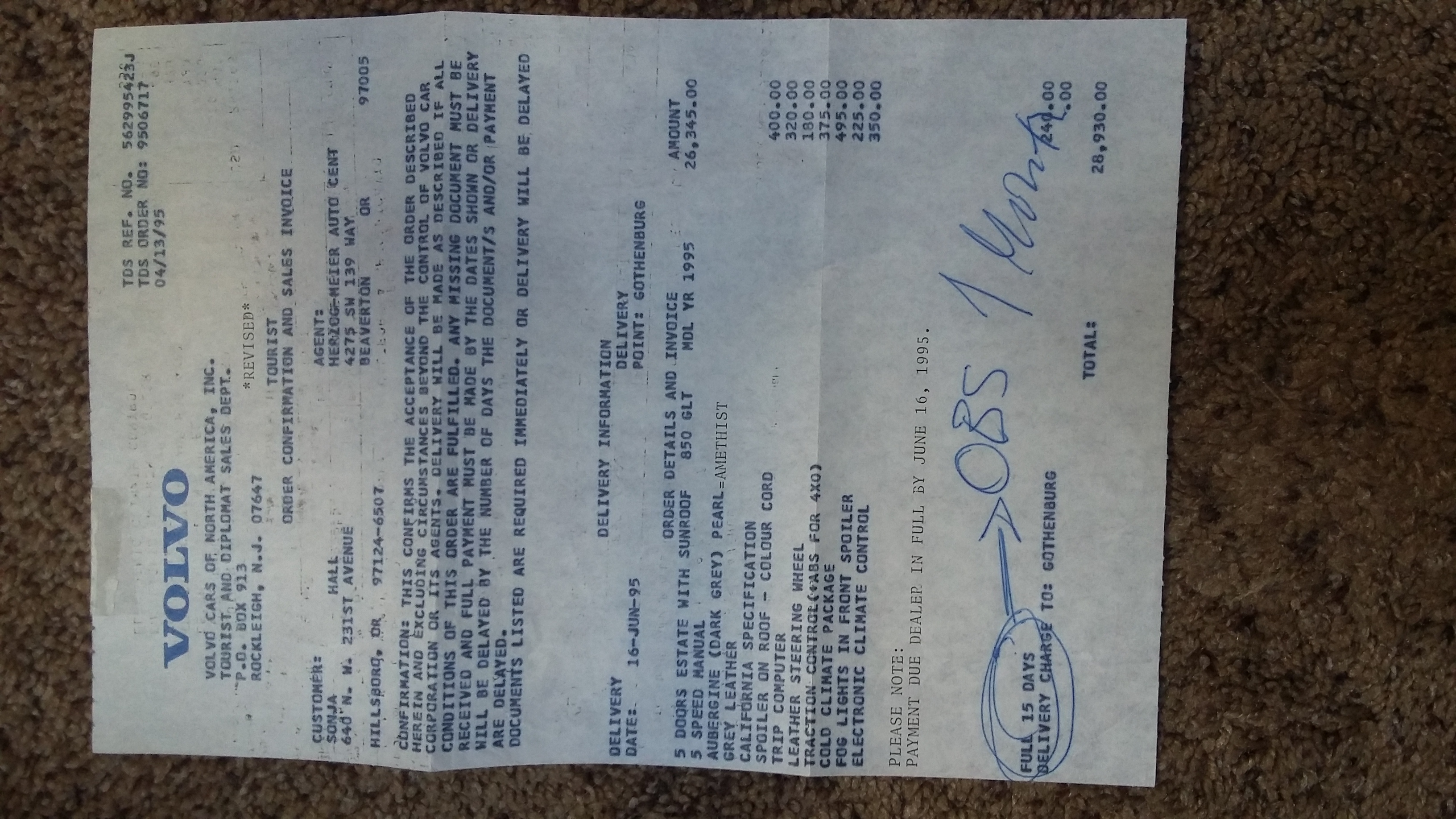 1995 850 GLT wagon, European model, 5 speed manual . 2.4 liter. Import invoice and "S" Europe sticker included. California package, including traction control, trip computer, leather steering wheel, fog lights, tinted sunroof, cold weather kit. Dark grey leather interior. Driver seat with minimal wear.