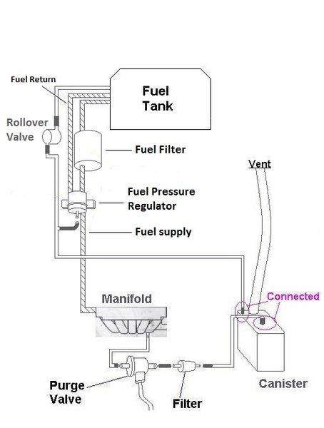 Note on the CharCan that only two lines are shown: VENT and PURGE. TANK is left off. The VENT line can't cause a P0-455, but the other two can. I've removed the J-hose more than a few times and it's held vacuum fine. So has the CharCan. But I may replace the former just to do it. Also, the special connector on the TANK line is suspect to me. I cut off the special connector on the PURGE line where it connects to the CharCan and used silicone tubing as it badly SQUEAKED when moved and seemed suspect.