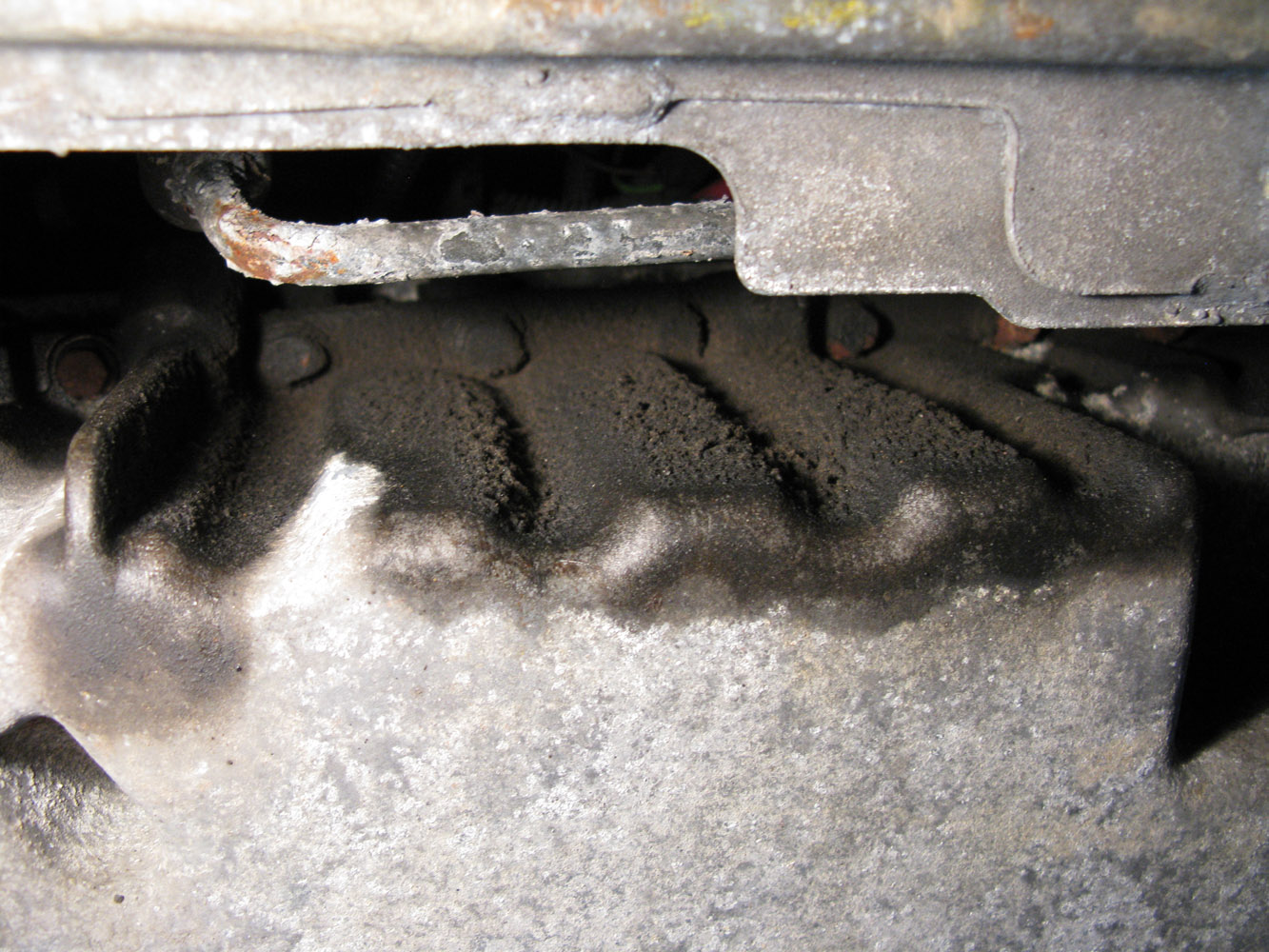 The front of the oil sump was covered in thick, dry crust. The oil below the balancer was all wet and mixed with debris. Oddly, I haven't noticed any puddles of oil on the ground below the car. I frequently drive for 350+ miles non-stop, so perhaps it only sprays off when the car is running. That would explain the expansive oil spray on the subframe.