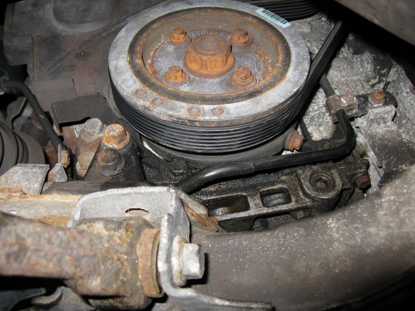 Here's the crankshaft harmonic balancer (damper) pulley shown from the front passenger's wheel well. I had already cleaned the oil from its lowest sections for this picture. No oil is spilled above the pulley, telling me the crankshaft is the leak source.