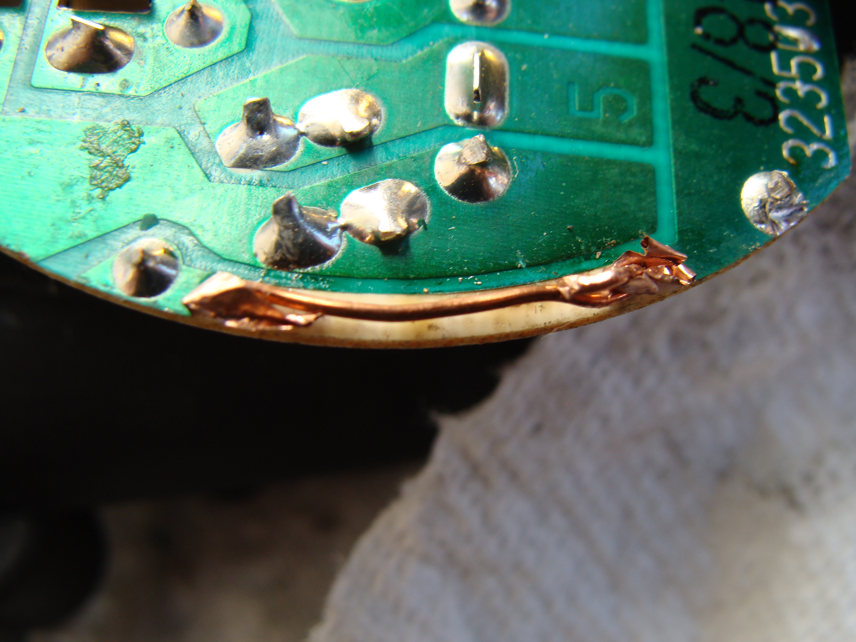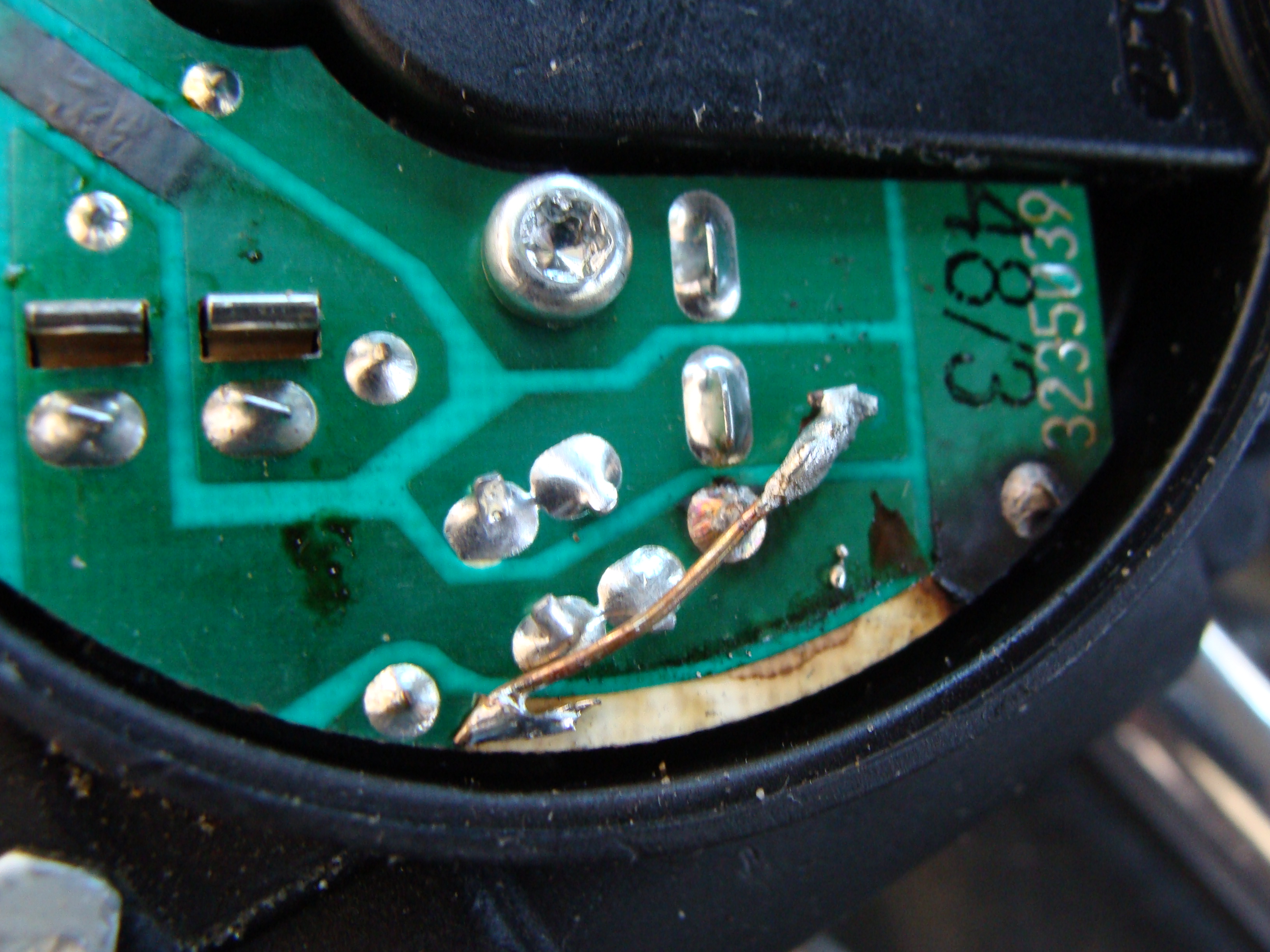 I then checked the motor itself. I popped off the black plastic cover protecting the circuit board, and found a copper ribbon had failed.