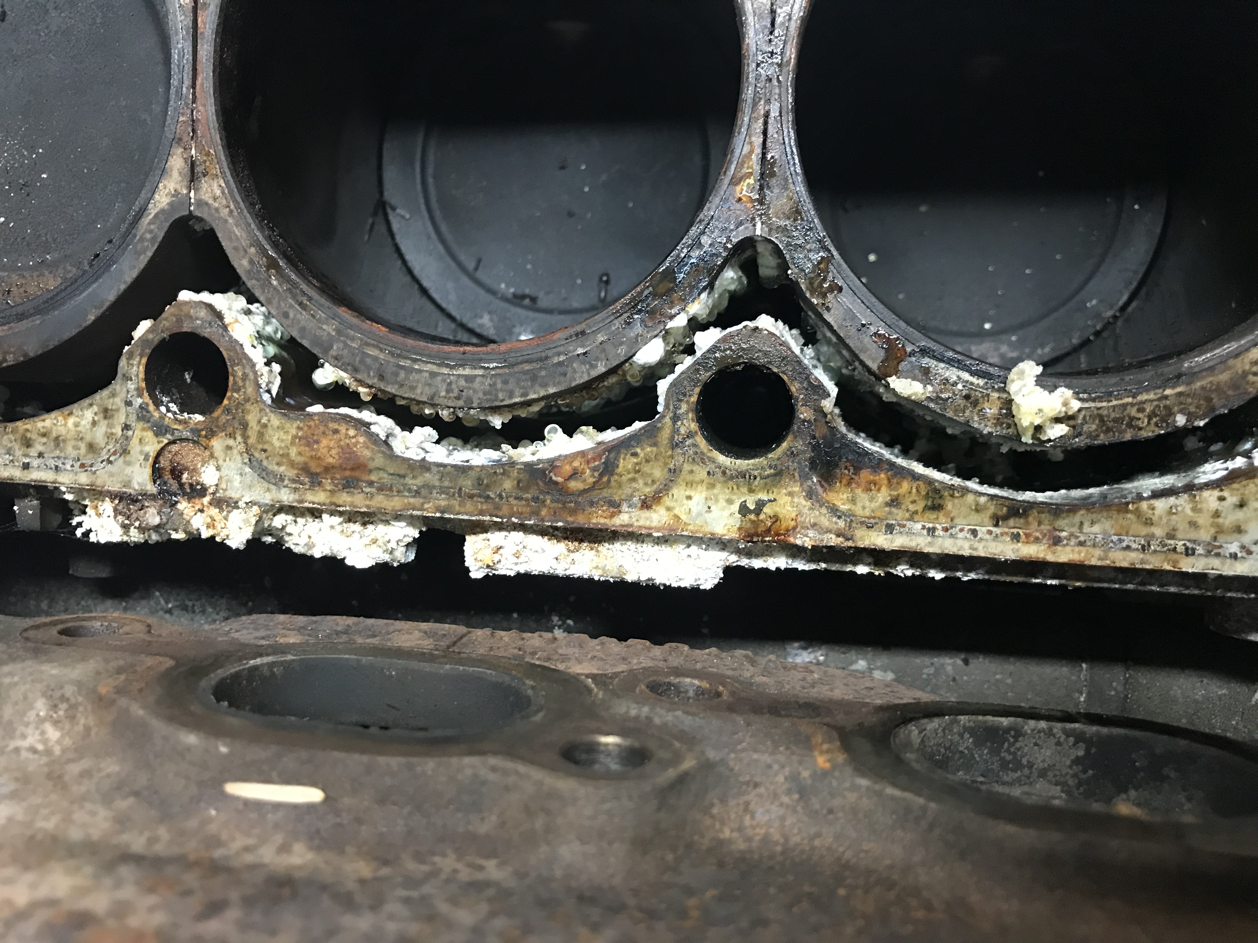 So we finally pulled the head off this car that’s been sitting for a while. Is the white crystally lookin stuff from the coolant when the HG gave up? Or what is it? What’s the best way to clean it up to prep for the new head?