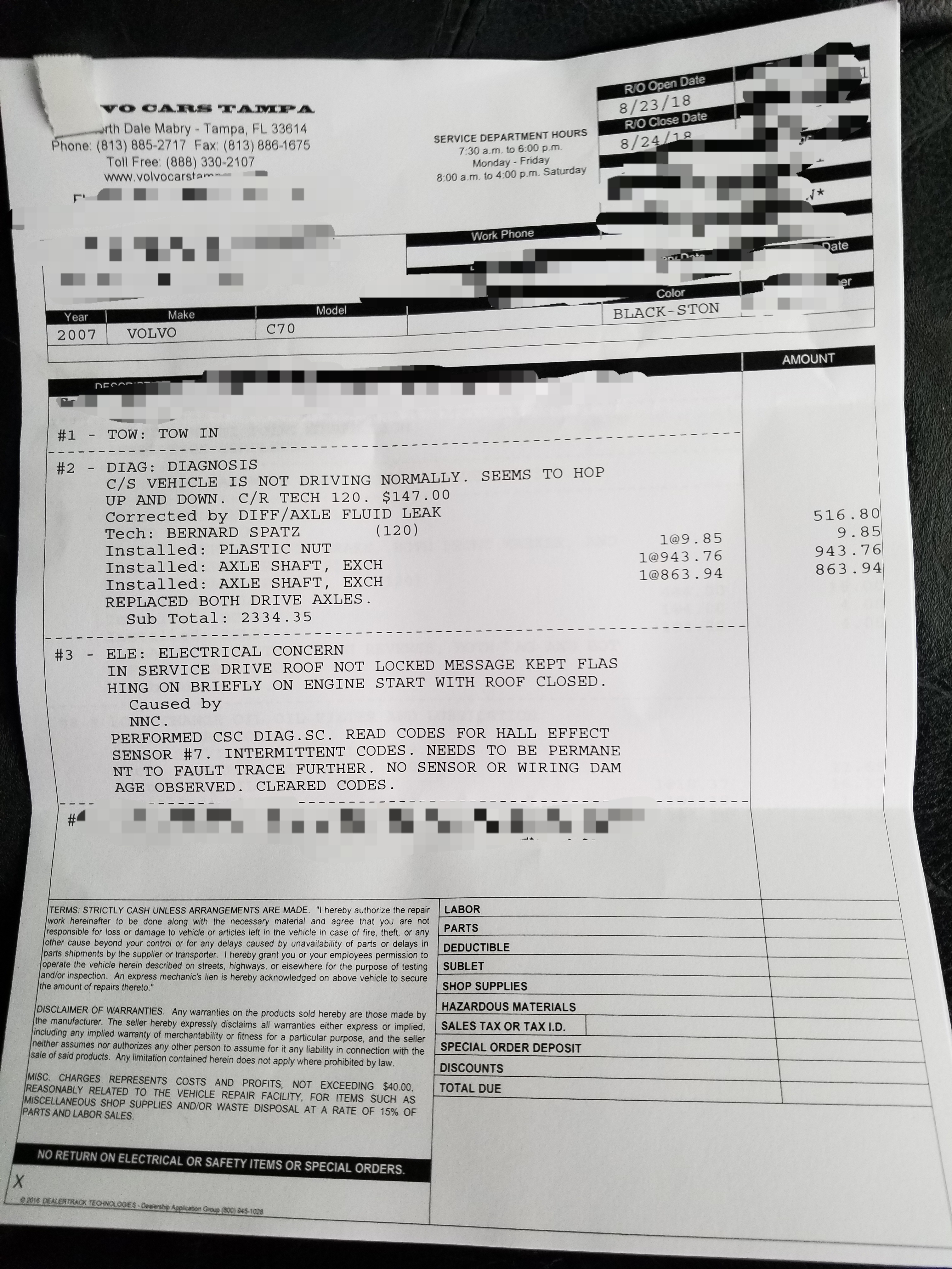 Replace both axles, control arms, tons of lightbulbs, oil change, shifter blind, alignment. $3779.69 repairs at Volvo of Tampa. A excellent dealer I highly recommend! June