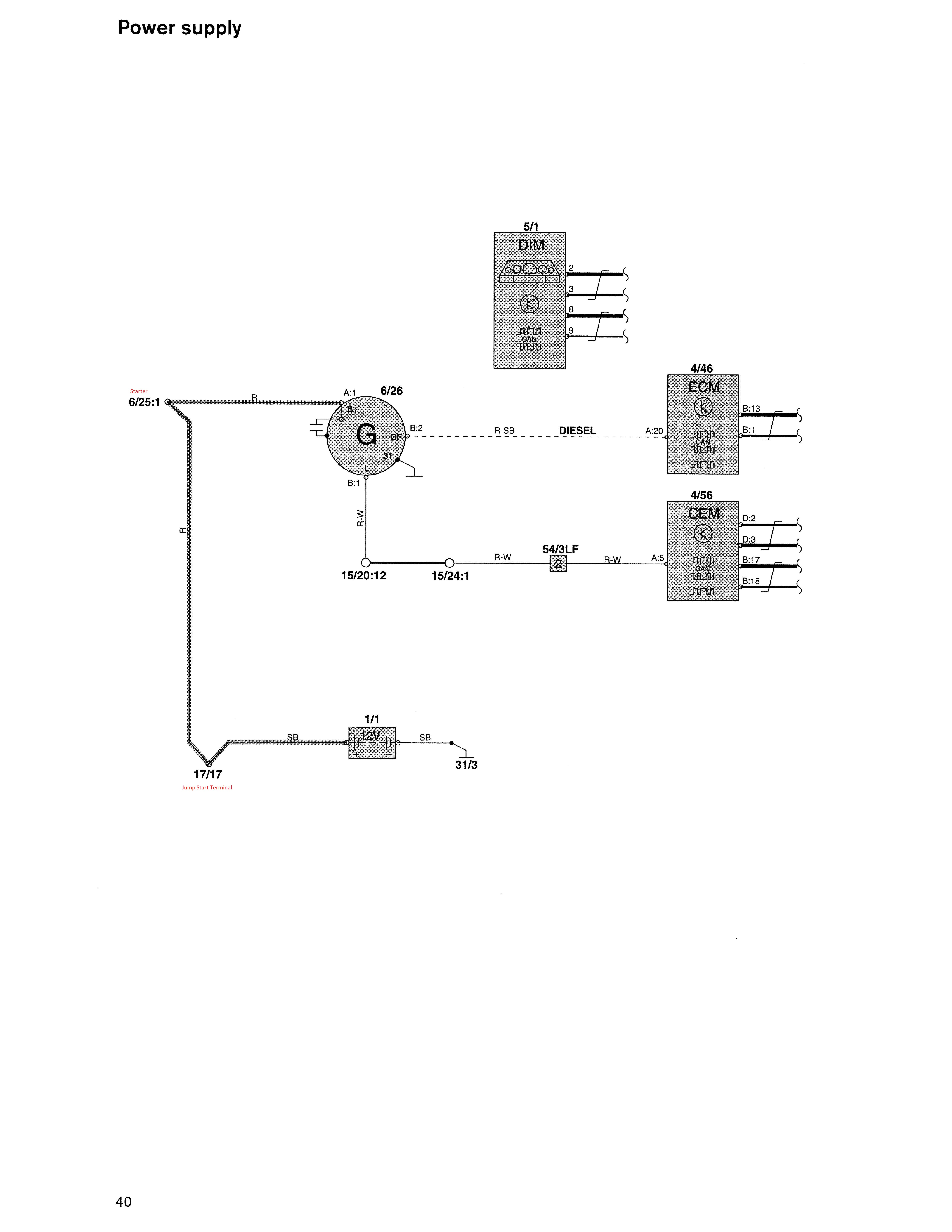 The B+ line runs from the Battery Terminal (+), to the jump start terminal (17/17), to the Starter (6/25:1), to the Alternator (B+). A defect along that run could explain the low L-signal and the slow cranking.