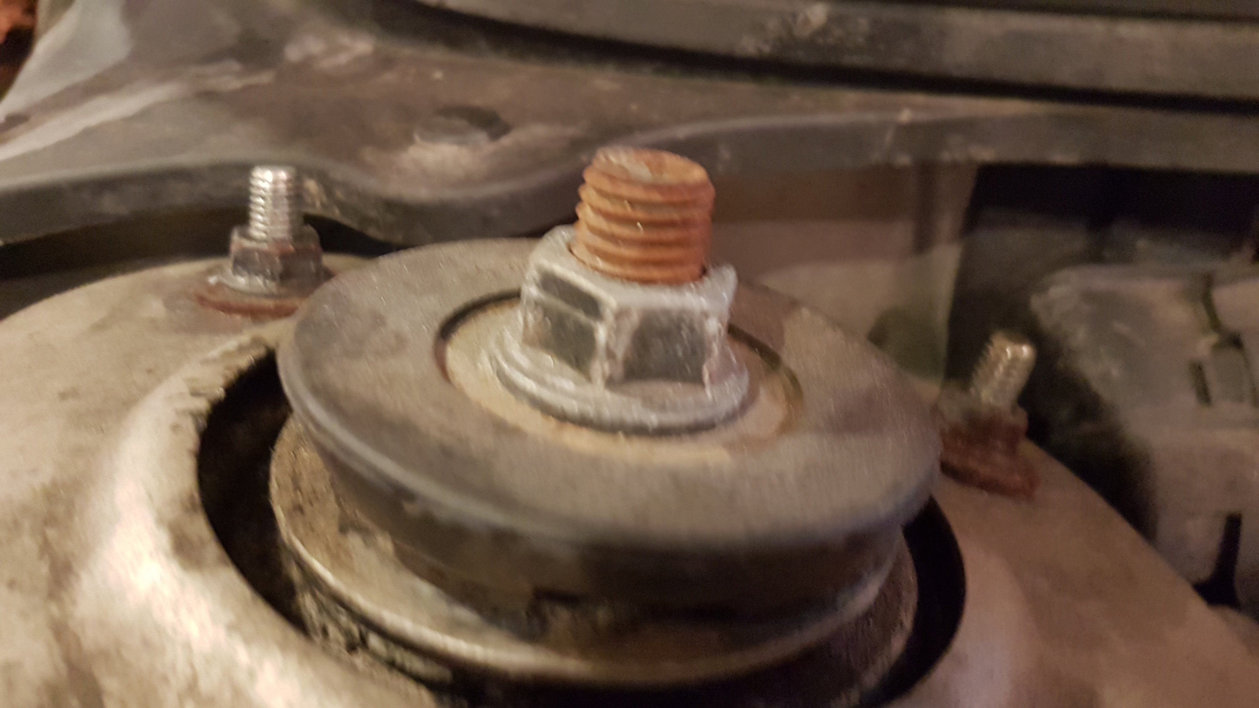 Passenger side - missing cap, 5-6 threads exposed - has punched through hood insulation and made mark in hood