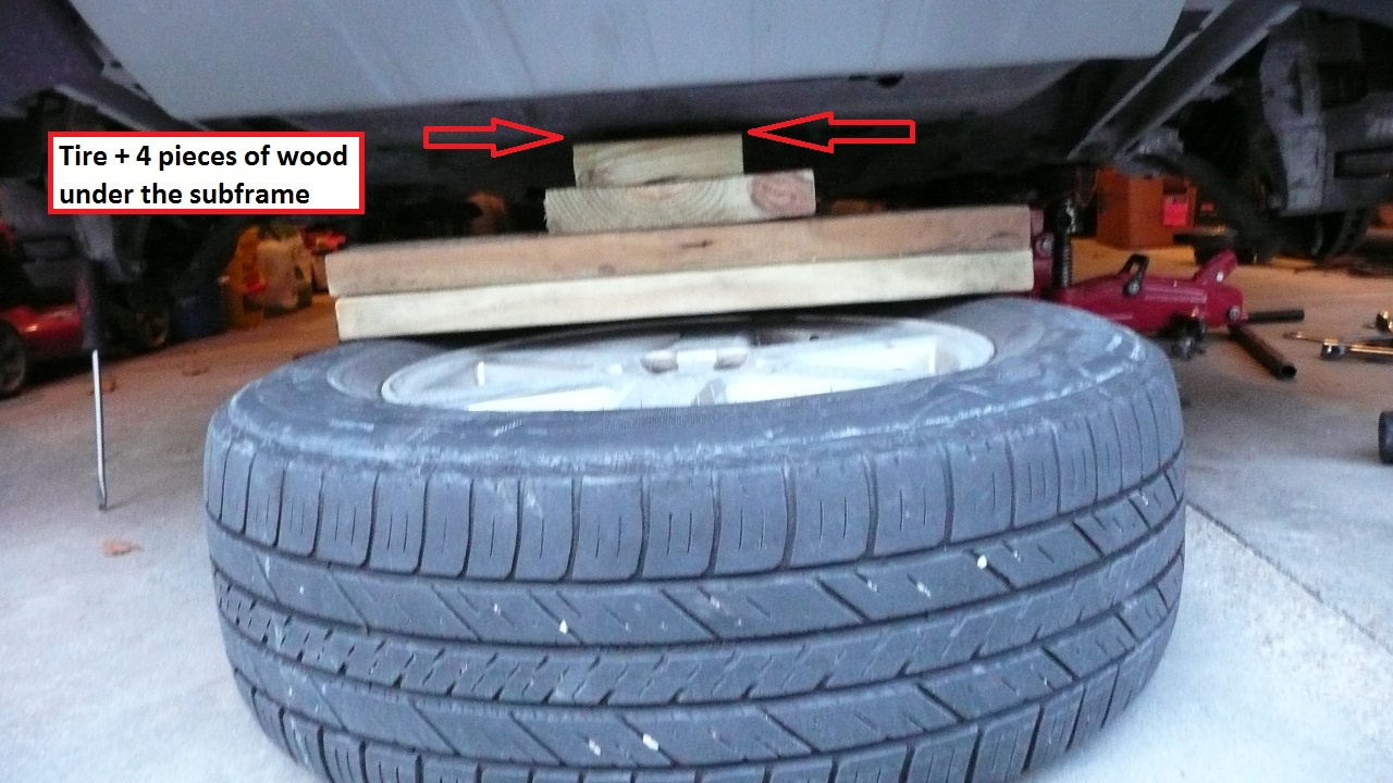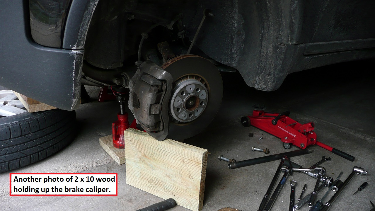 - A piece of 2 x 10 wood is very useful here to support the heavy knuckle/rotor/brake caliper combo!