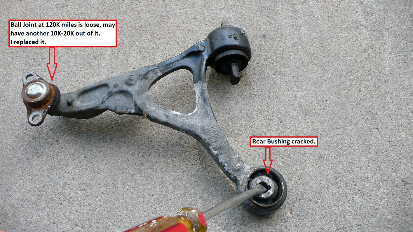 - Inspection showed cracked rear bushing in control arm.