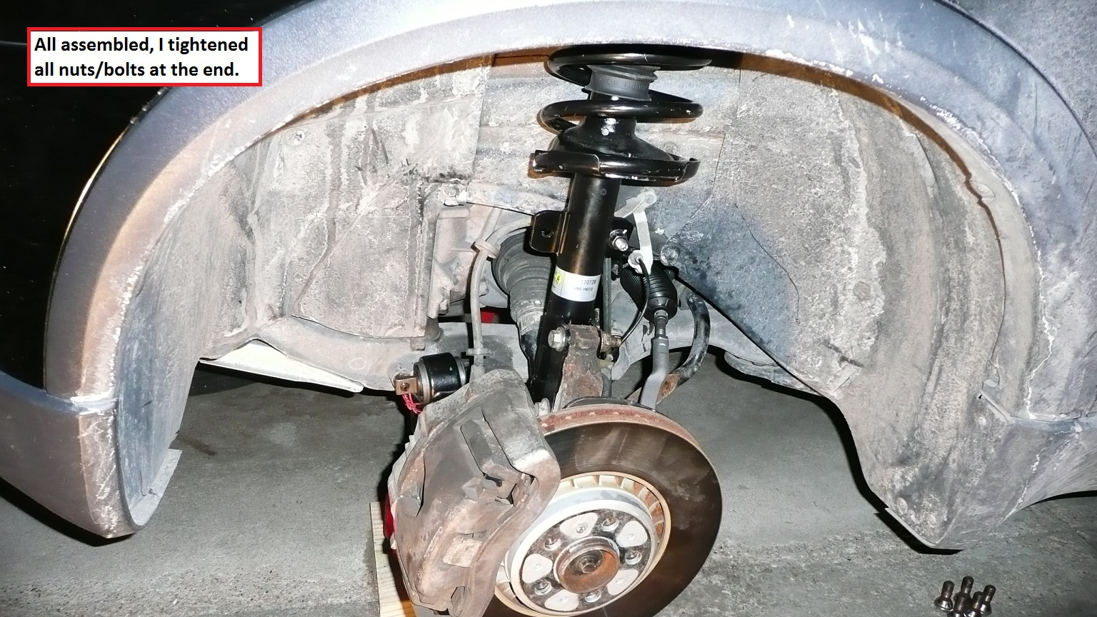 - The Bilstein strut: the holes for ABS bracket are a tiny bit off, so I trimmed the ABS Plastic Bracket edge a bit so it sits flush.