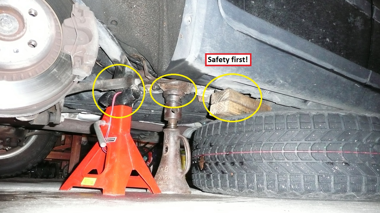 - Jack below control arm until car is gently lifted off the jack stand by 1-2mm (safety first!), then tighten these nuts/bolts.