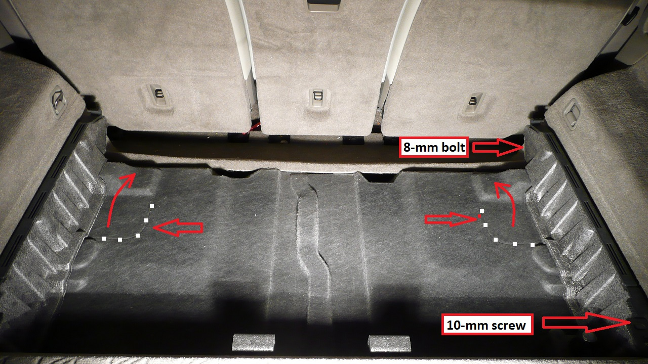 - Remove floor cover, cut the carpet with utility knife as shown. Remove the 8-mm bolt and 10-mm screw as shown to lift the Styrofoam side rail up a bit. Open the plastic cap to expose the shock absorber top nut. Spray the nut with some PB Blaster and let it sit.