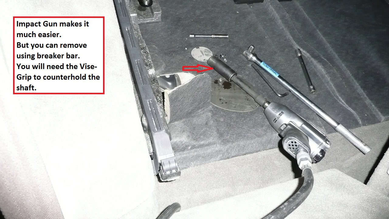 - To remove, spray PB Blaster to top nut (rusted), clean the inside of T40 recess if you use T40 socket. I used air gun + Vise-Grips on the shaft (use a utility knife to cut the plastic sheath to expose the shaft). You do NOT want to round this top nut, so air gun is a must! If you don’t have an air gun, drive to a shop and ask them to loosen the nut for you for a few turns (do not remove it at the shop!). Or get a socket with a hex on the outside so you can use a wrench to turn the socket…