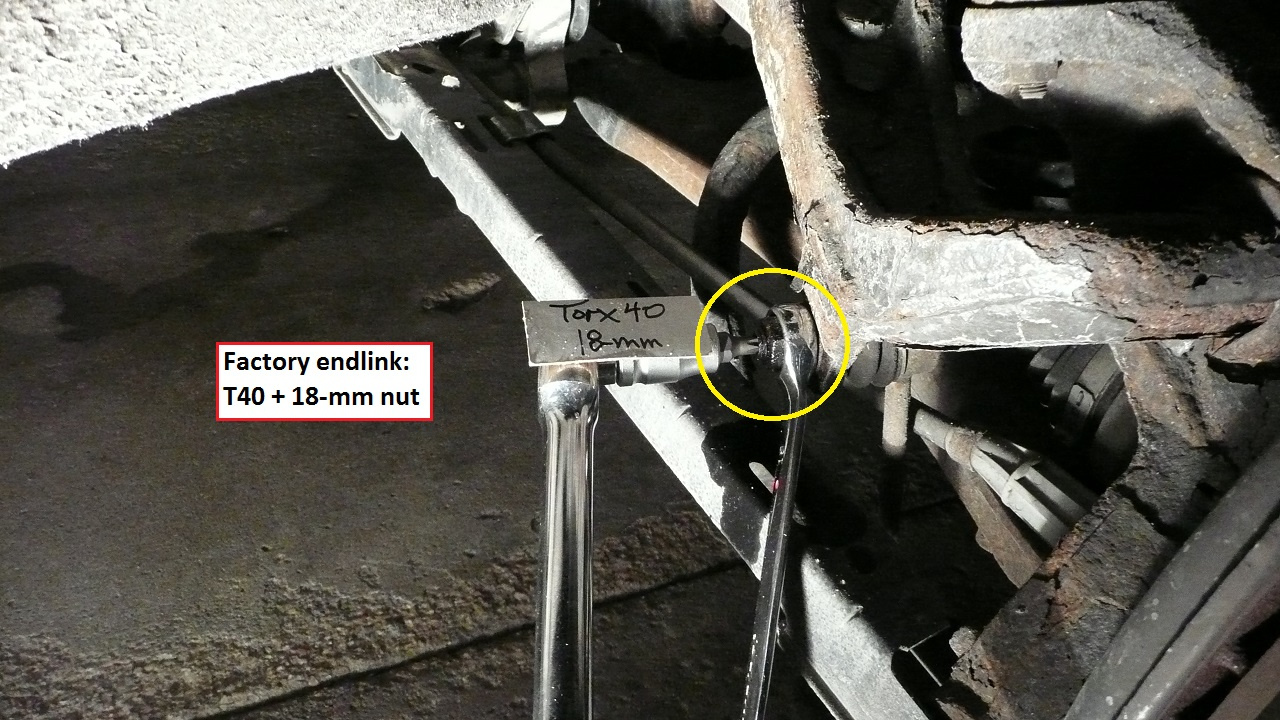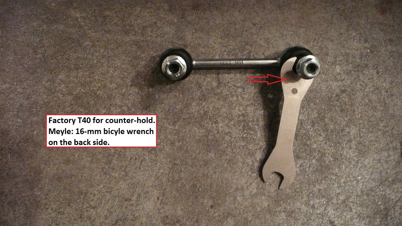 - Swaybar end links: Factory is T40 Torx for counterhold. The new Meyle has 16-mm on the back side for counter-hold. Only thin bicycle wrench works here if you use Meyle…