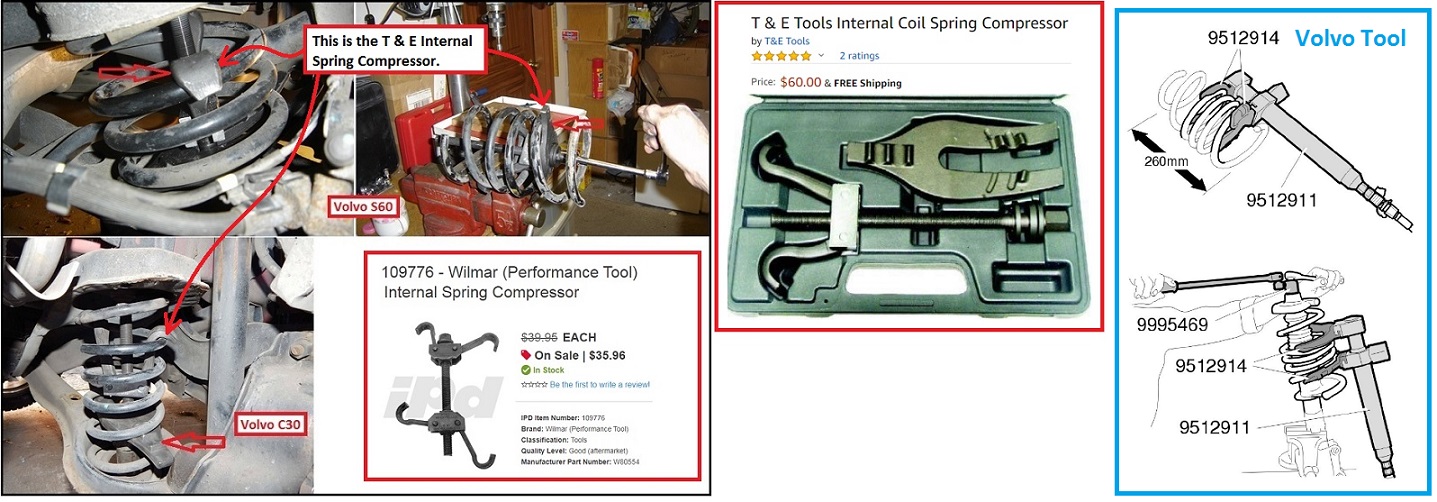 - Installation note: Volvo has a very expensive tool to compress the spring bc the car is on the lift. Alternative choices are T & E brand or Wilmar as shown in the photo. I just don’t like the idea of the entire spring being compressed by a single bolt as seen in the T & E and Wilmar tool (I understand it is safe but I don’t like it). The nice thing about home garage is the car is on the floor, thus one can use floor jack to compress the spring.