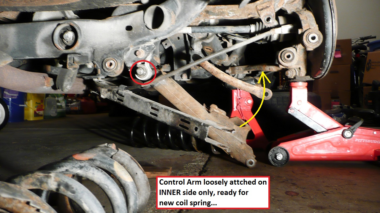 - Initially, I made the mistake of removing the C.A. completely. Later, I learned that all you have to do is removing the OUTER nut/bolt and loosen (but do NOT remove) the INNER bolt. This allows the control arm to drop to the ground without twisting the bushing! Note: before removing OUTER nut/bolt, I supported the C.A. with 1 floor jack and 1 scissor jack.