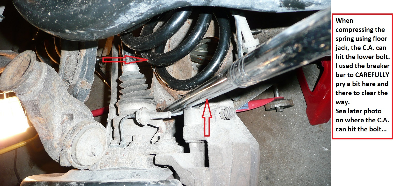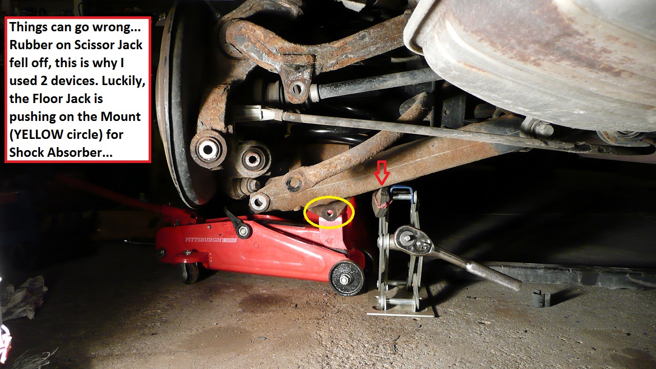Remember you are compressing > 1000 lbs using floor jack, so correct placement of the jack is essential. I used the shock absorber mounting point as a place to jack.
