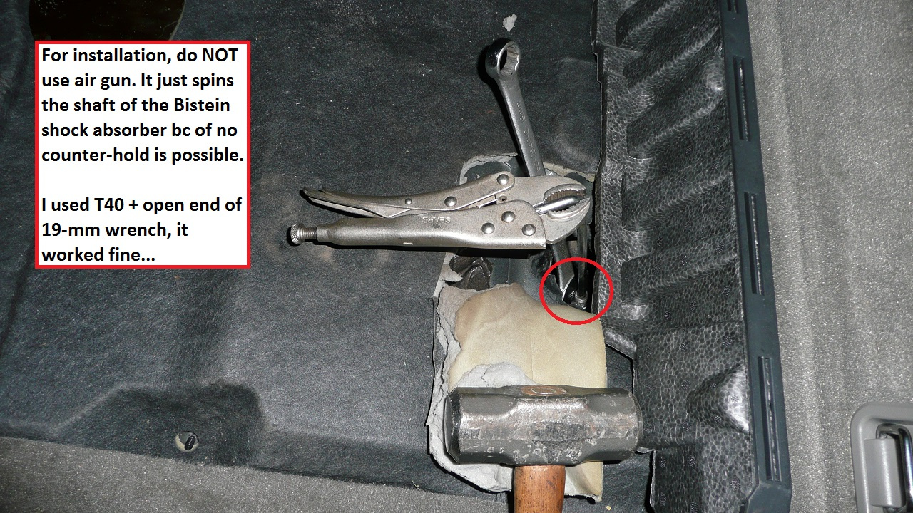 - This is also a good time to tighten the shock absorber top nut bc the spring is being compressed to push the shock upward. Note: the air gun was good for removal but during install, it just spun the shaft around: try to avoid this as spinning the shaft too much can damage the shock absorber. So, for shock install, use the T40 and open wrench as shown until it is tight (don’t strip the nut).