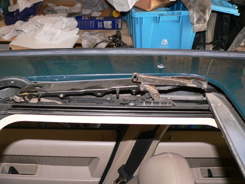After doing even more searching, I found this post, viewtopic.php?t=30828, which is the same issue but the broken piece in this photo appears to be the one towards the front of the car and ours is towards the rear. Anyone have any idea how to move the remaining broken piece around to get the sunroof to close? Right now there's about a 1/4 inch tilt on it, so it's not a tight seal. That would buy us time to figure out the fix.