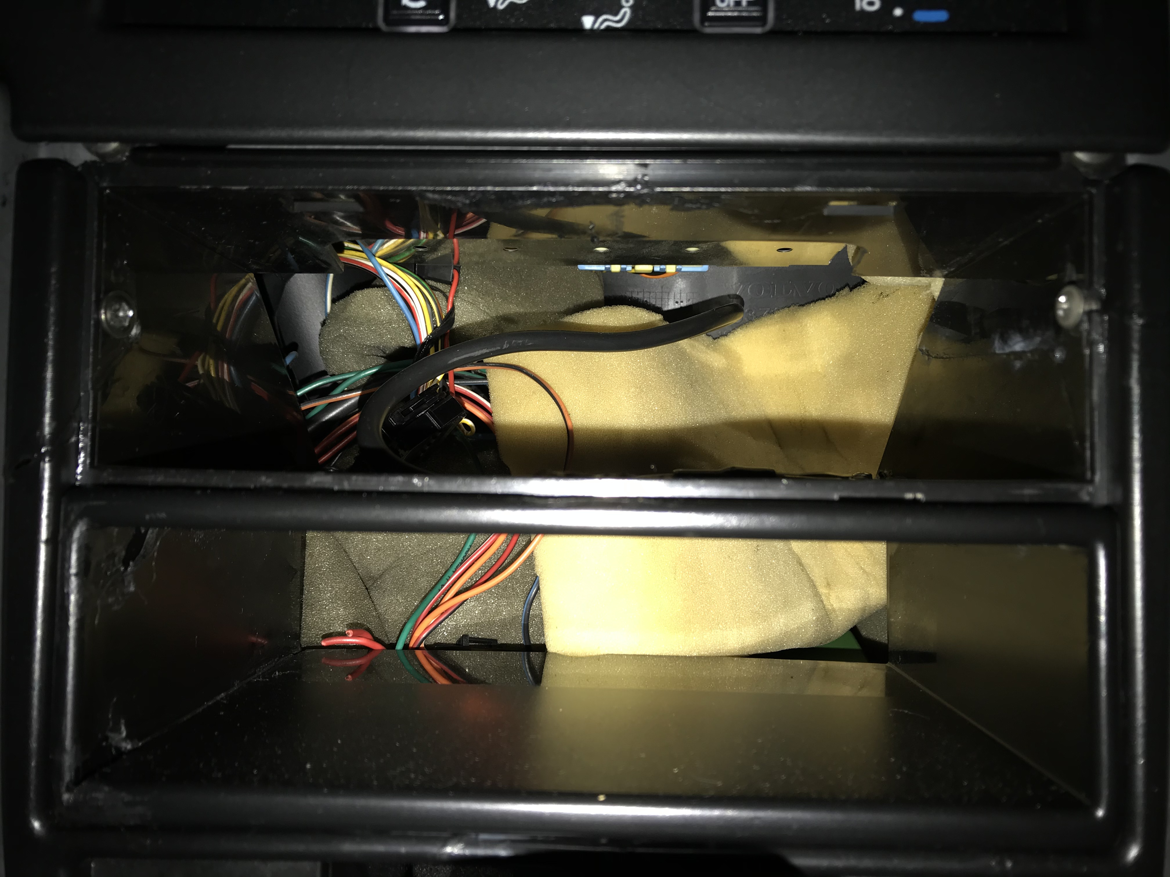 It looks like someone modified the original double DIN opening to accept a single DIN radio with a single DIN tray either above or below the radio. It looks like the radio was on top and the tray was underneath, but there is not a back on the bottom tray which is odd. My 1994 960 has the SC-810 double DIN height radio / cassette tape with a CD changer in the boot or trunk, whichever you prefer. It also looks like a lot of wires are cut on the connectors.