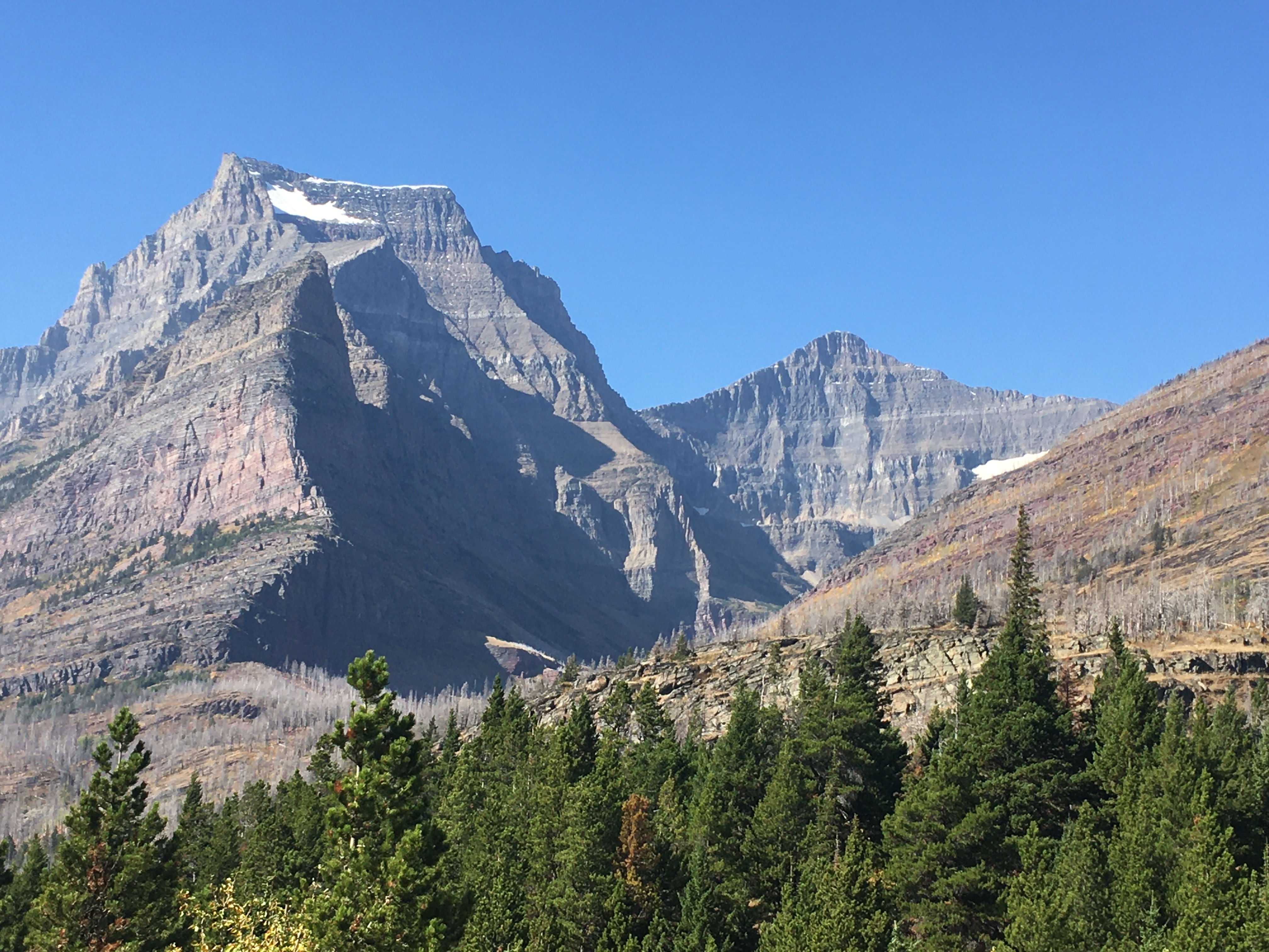 That's Bear Hat Mountain to the right foreground, and in the distance on the left is Gunsight Mountain with the snowfield. On the shaded side of that peak (not where the sun is shining on the snow), is Sperry Glacier down in the shade. Most of the glaciers have shrunk way back in the last 30 years.