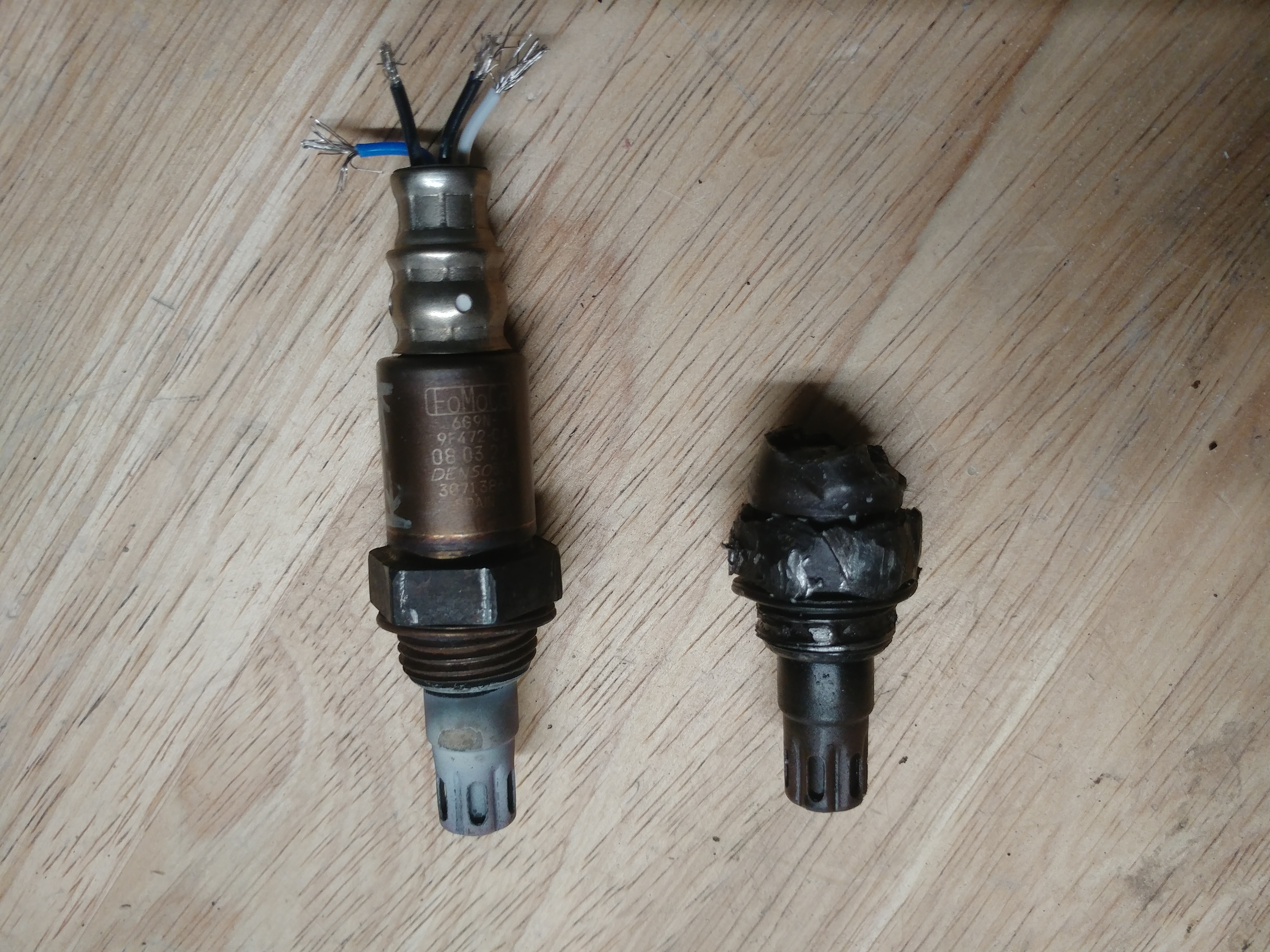 Finally got the sensor out. Using a Dremel tool with an abrasive cutoff disc, I cut the metal jacket about 3/8" above the hex. As the jacket is filled with ceramic, you have to cut the metal all around the sensor and use a hammer to break the ceramic. Then using the IRWIN Tools Bolt Extractor, 7/8-Inch / 22mm, 1/2-Inch Drive (53916) I was able to back the sensor out. Work the bolt extractor back and forth to lessen thread damage to the exhaust manifold bung. My threads had some damage so I purchased a M18 x 1.5 thread chaser to clean up the damage. I coated the new sensor threads with anti-seize compound and finally had a working sensor instead of the dead one I had been driving around with for over a year. The one on the left took 30 minutes to replace and the one on the right took over a year. :D