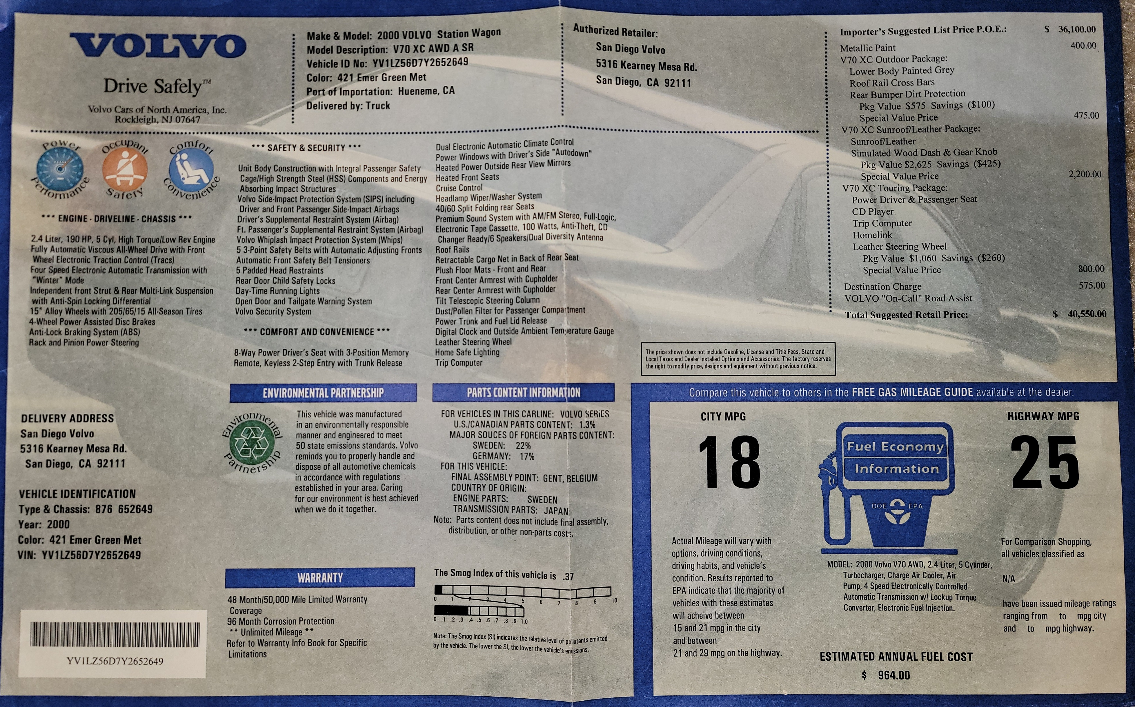 I was so close to buying a new one back in the UK in 1999. I had gone to look at a V70 D5 auto (diesel 5 cylinder) to replace my 1992 940 HPT wagon special edition. The V70 diesel was a great car with loads of torque aligned with a great auto trans. It would manage about 45+ mpg (UK mpg) easily. I was all ready to sign when I saw a used red V70 T5 that was 1 year old. I recognised the car as having belonged to a local prestige taxi company we used for work. It was the owners wife's car. They changed her car every year. It only had 10,000 miles, a stick shift and was mint. They really looked after their cars and always dealer serviced. When I asked how much the answer was about half new price. I guess you know what came home with me. It was a full fat Euro spec 240 bhp motor and went like stink. I was so sorry to sell it when moving to Canada. Car was still mint and was detailed every 2 months.