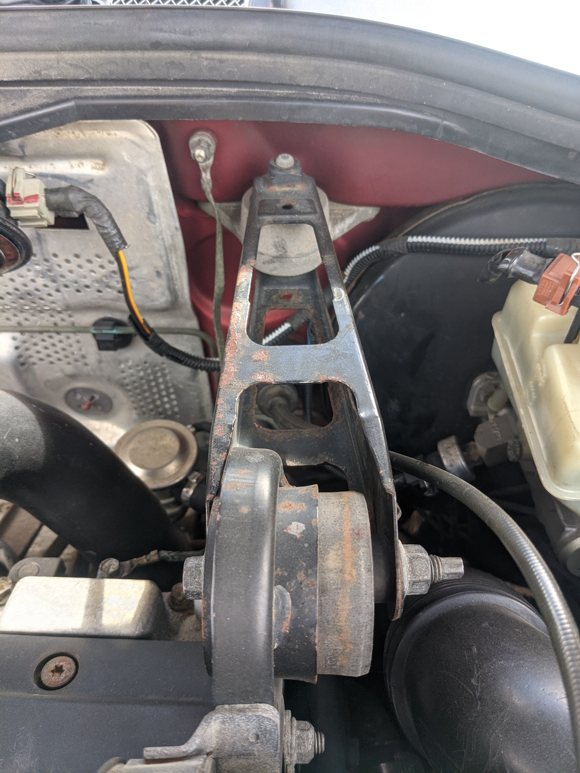 I checked my front mount, it looks ok. I am planning on changing all of my mounts in the near future. Engine looks level looking at it from the front. I can slightly shift the mount side to side on the engine bracket, so I think there was a bit of twist in the rear mount from tightening the bolt, and normal engine vibration caused the front bushing to vibrate out of the mount. I shifted it as best as I could to the center for now. I have an ipd poly Mount bushing for that somewhere, a guy was selling it who also had the 17" pegasus rims that I am running.