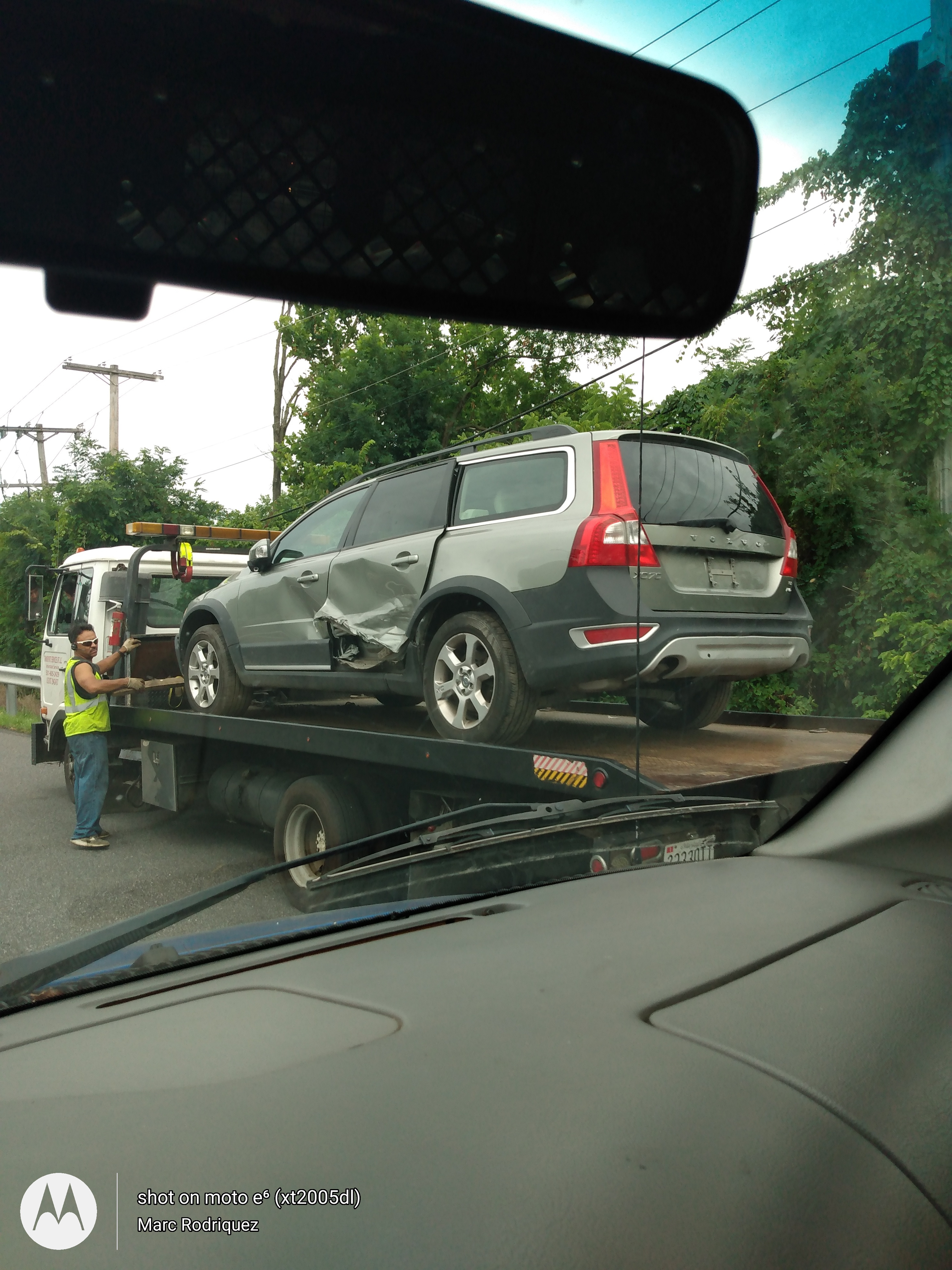 Did something tall, like a pickup, back up into it hard? Or something was coming at it from the drivers front and hooked it right at the back of the drivers door. Didn't hit the sill, didn't scrape down the side, and it doesn't look like the Volvo was sliding and hit a hydrant or something.