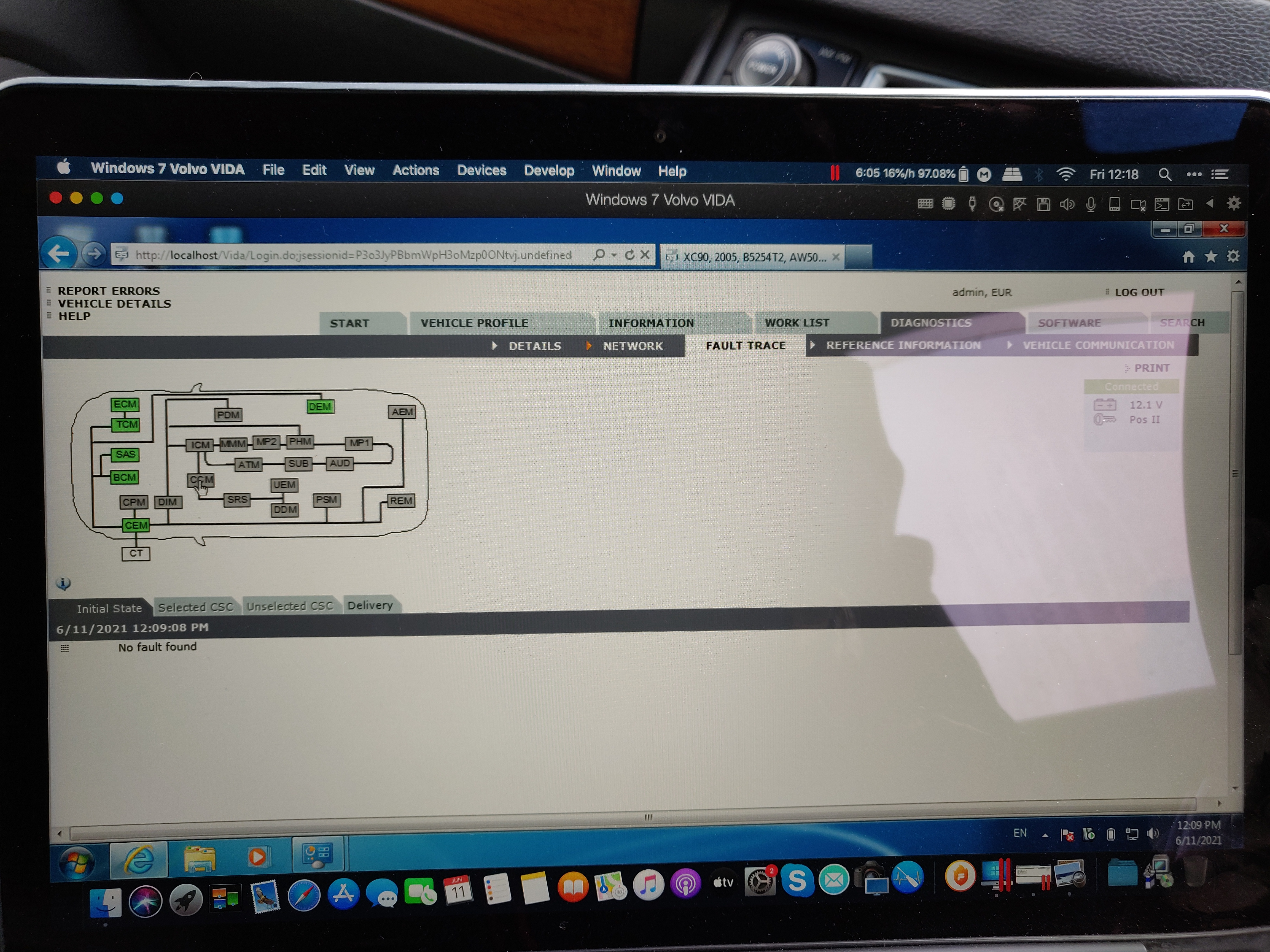 Background: I've got a DICE unit off eBay and the tests for DICE diagnostic passes. Installation of VIDA has been all good. Reading car Vin and details works fine.