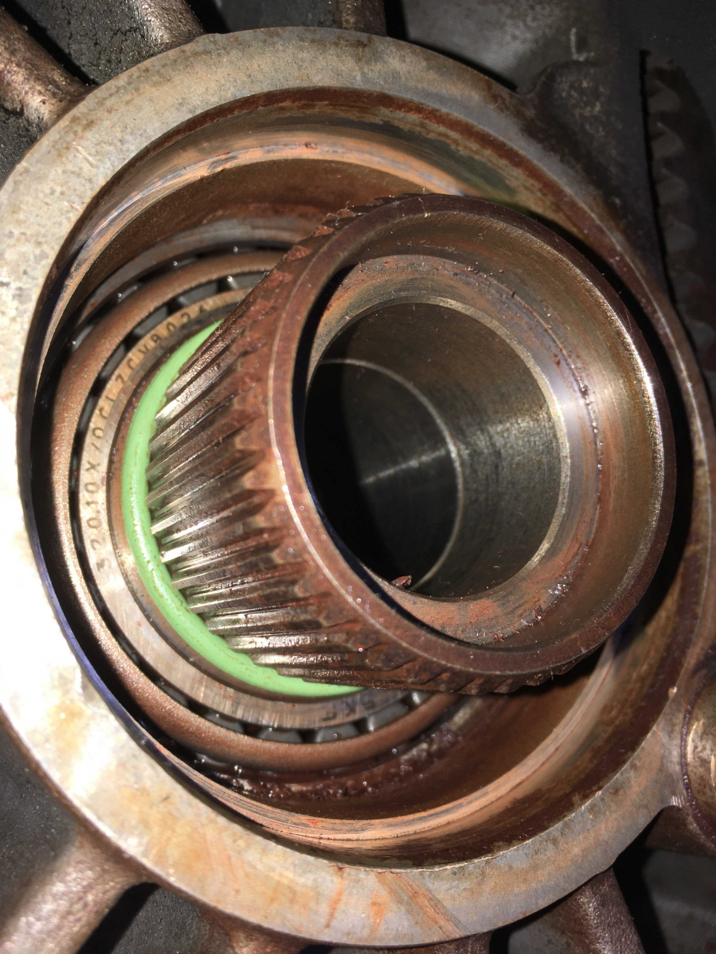 Here's a link to a post I did last year, It is for an automatic not 5 speed which doesn't have the green o-ring but provides some insight on collar sleeve protrusion and installed depth. The collar sleeve has an inner circlip that controls the depth on the angle gear. That your's is pushing out slightly or pushing on the o-ring is probably engineered to provide good sealing would be my guess. The straight cut spline shouldn't cause any axial movement on the collar sleeve so I believe a minor interference caused by the o-ring would be helpful in sealing. This thread is a bit lengthy but I hope it helps.