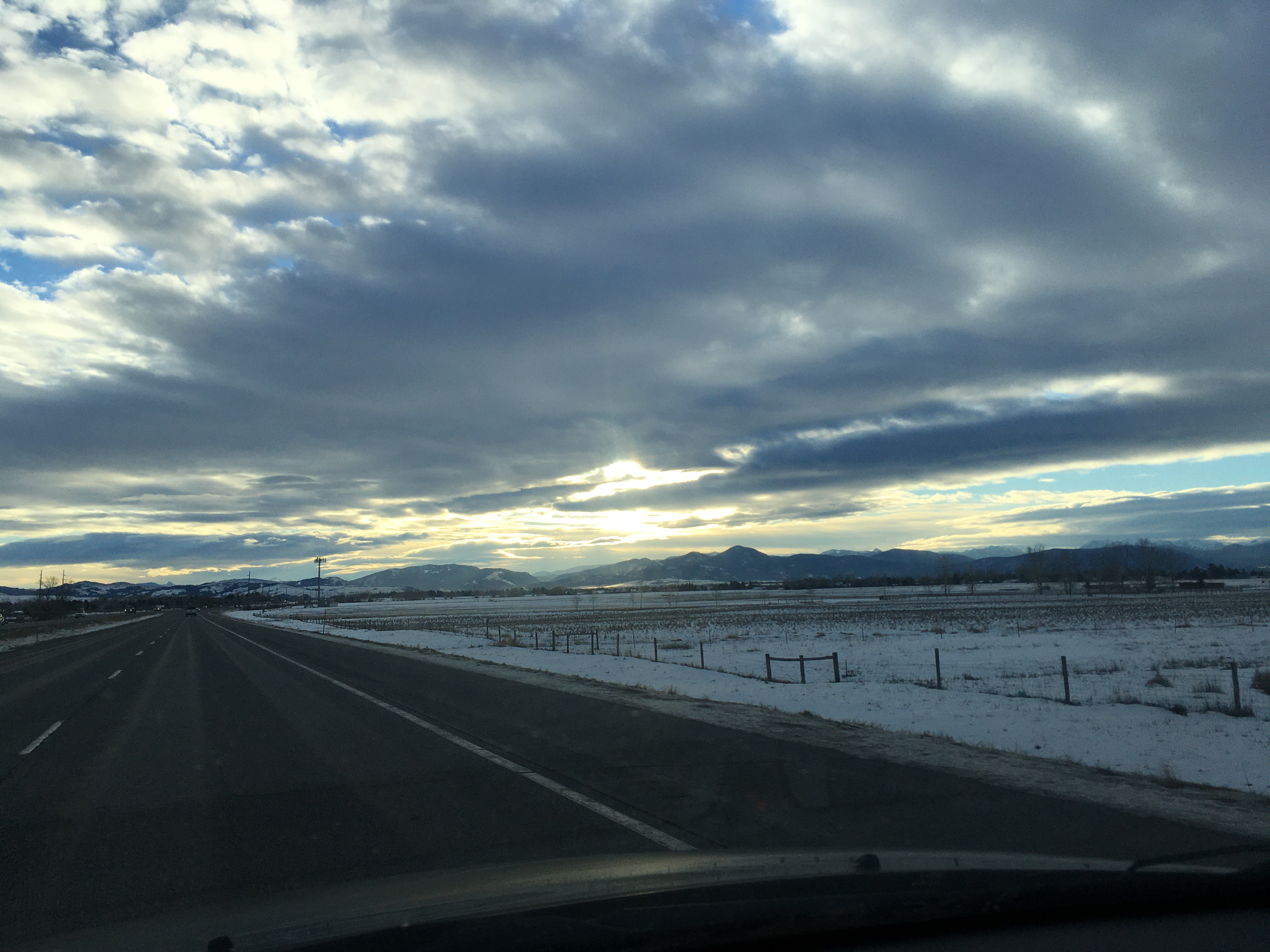 Thin haze / fog down low, the temp dropped 30 degrees in miles. Cool to see the very edge of a cold front.