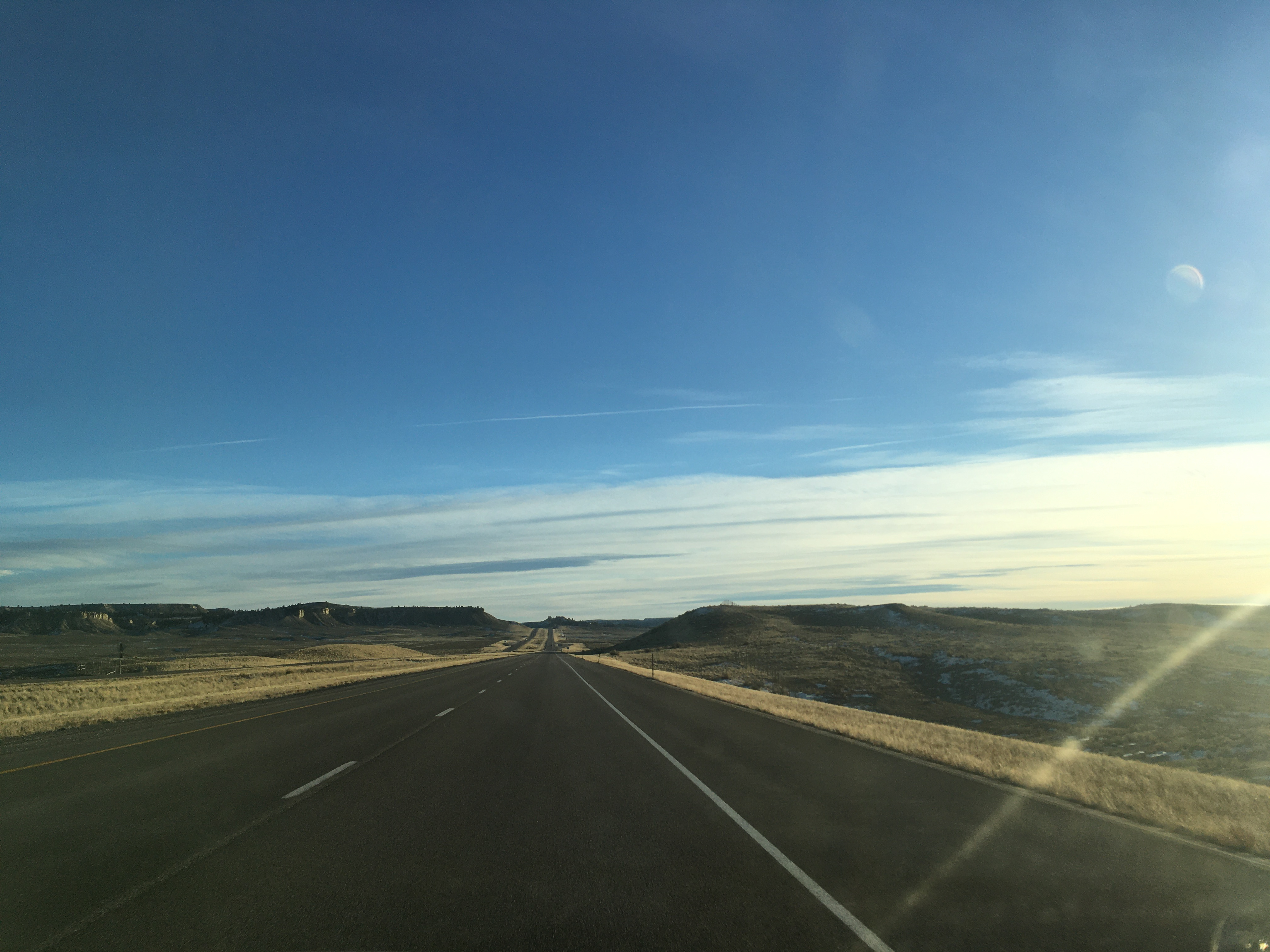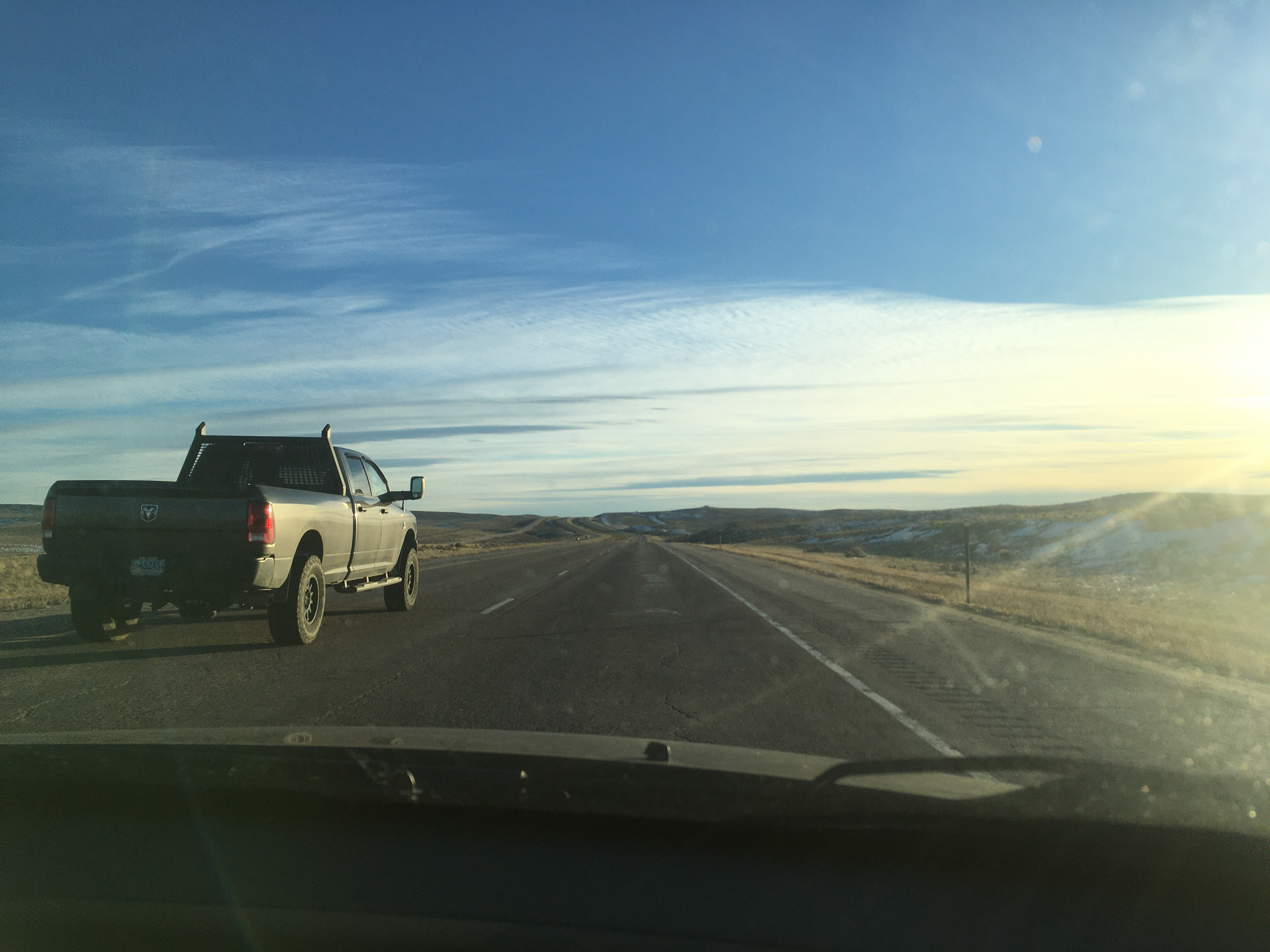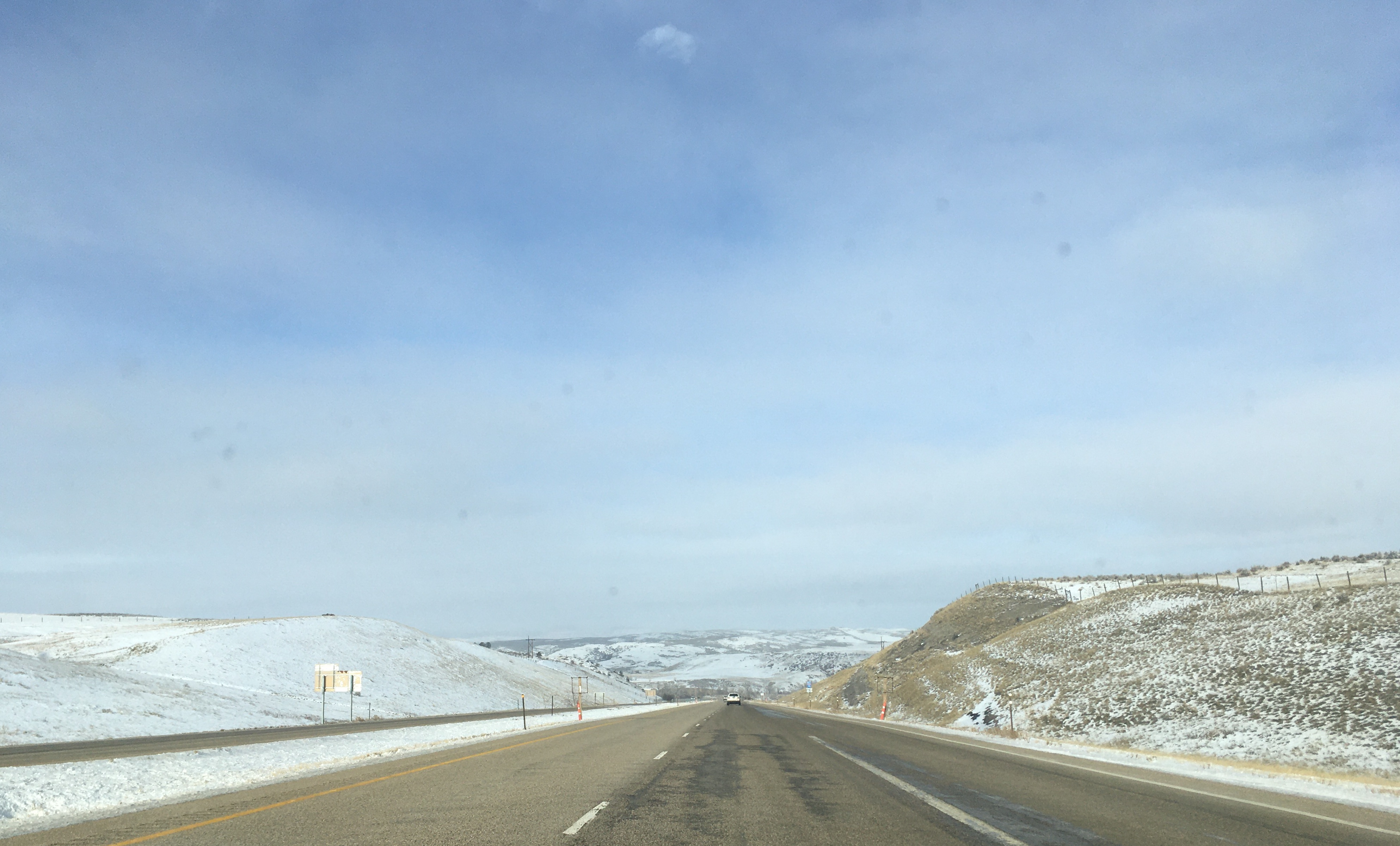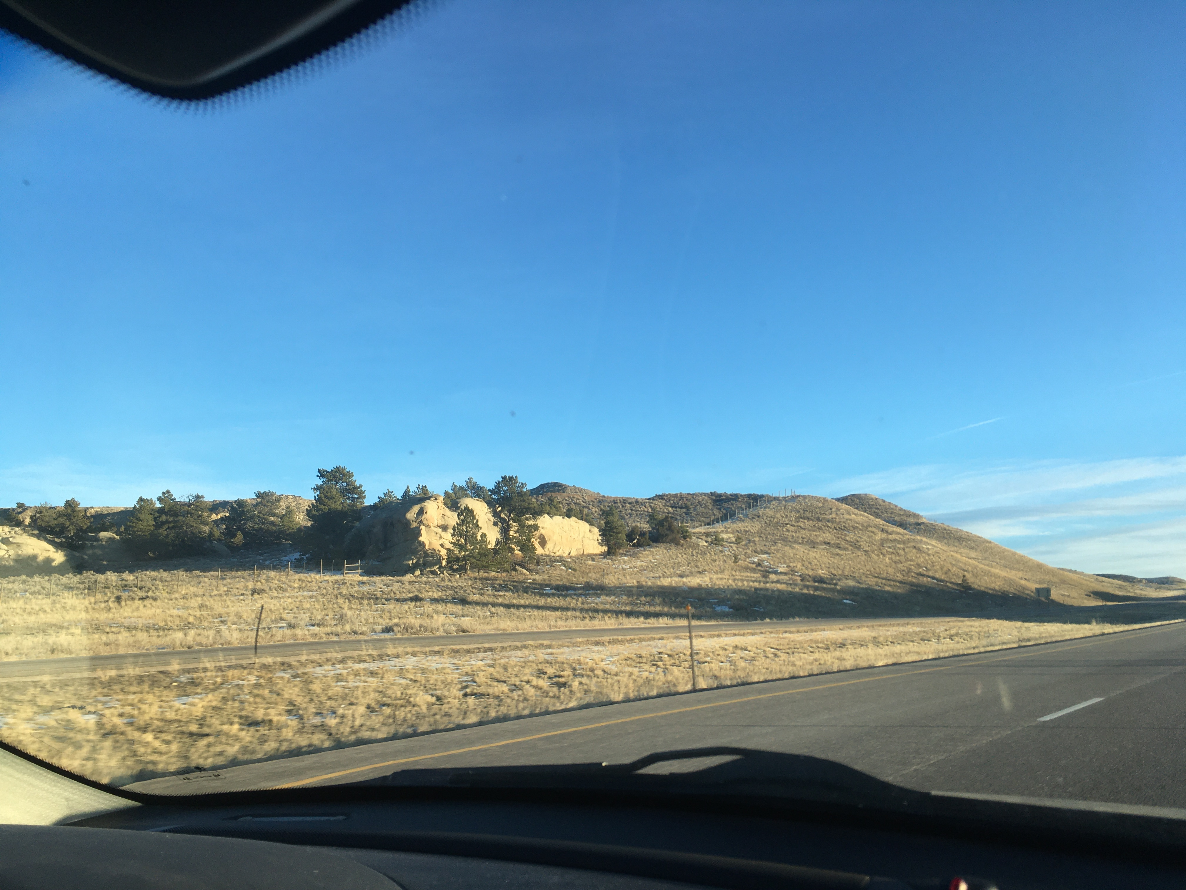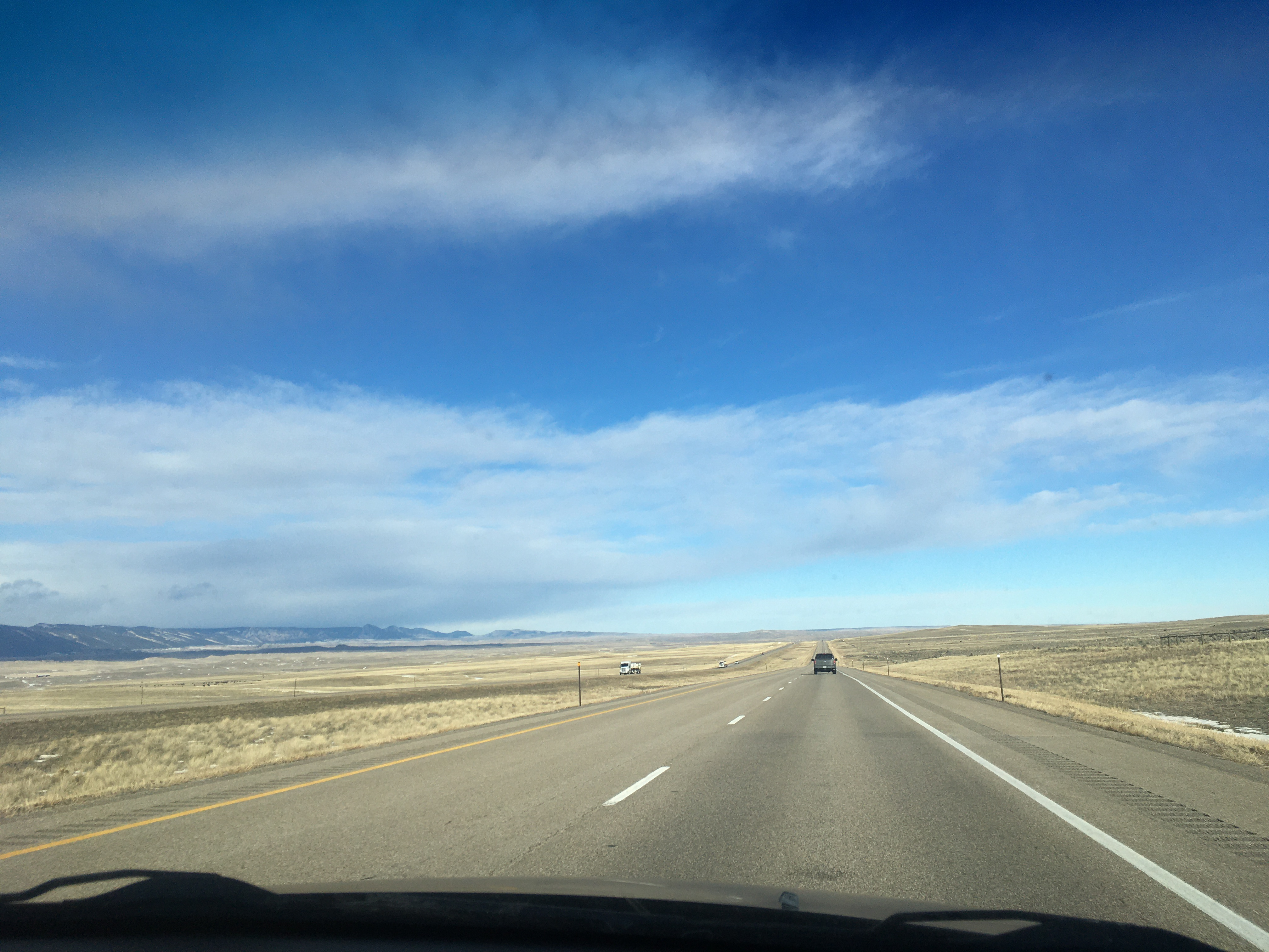 Hours have passed between those pics. See that long low dark lump in the second one? That's a mountain range, a big one, way off in the distance. First mountains you've seen for hours. At the very base of that thing is Casper Wyoming, and you turn 90º left to go around it and south to Cheyenne. Distances between towns are in the hundreds of miles sometimes.