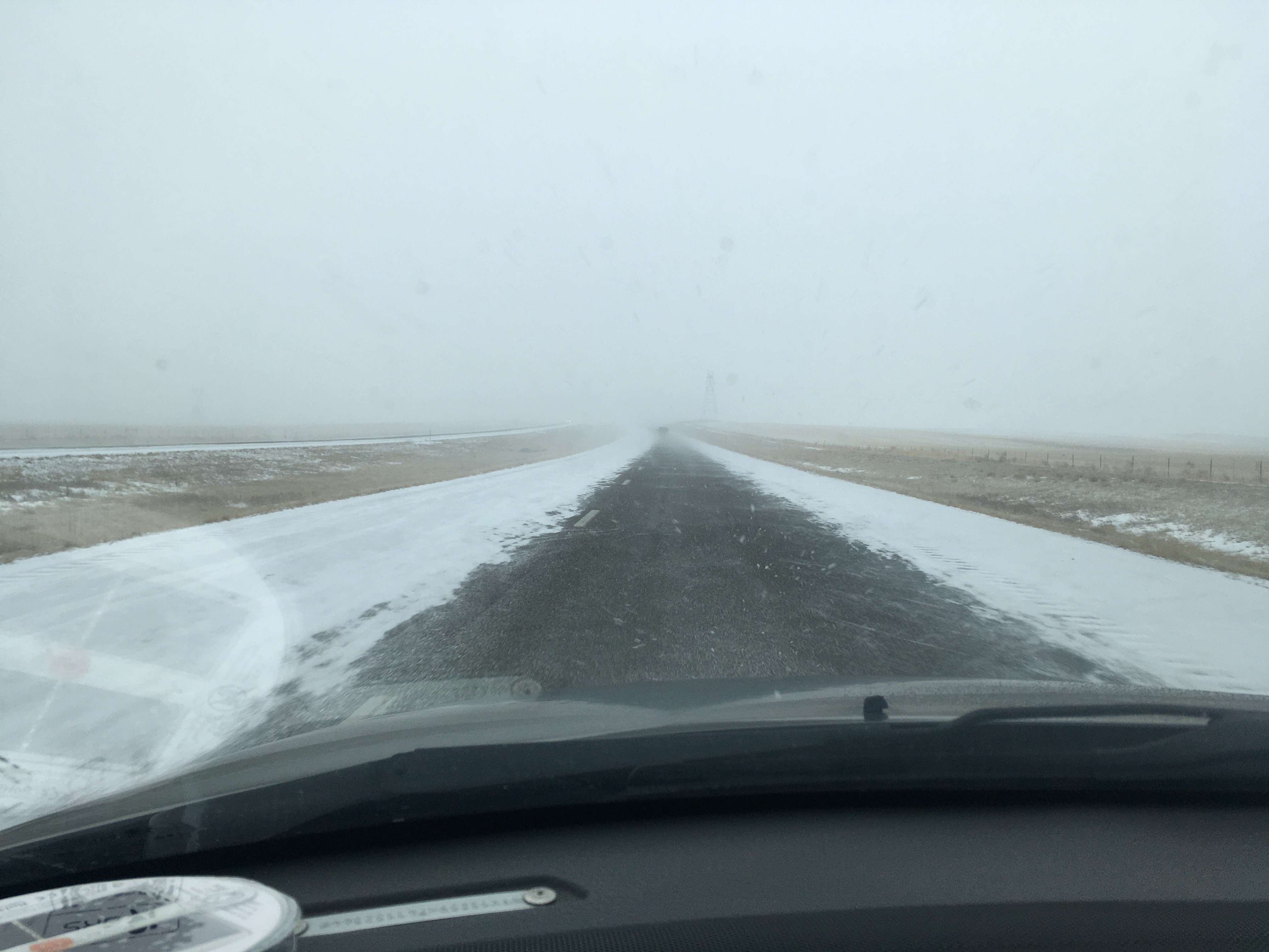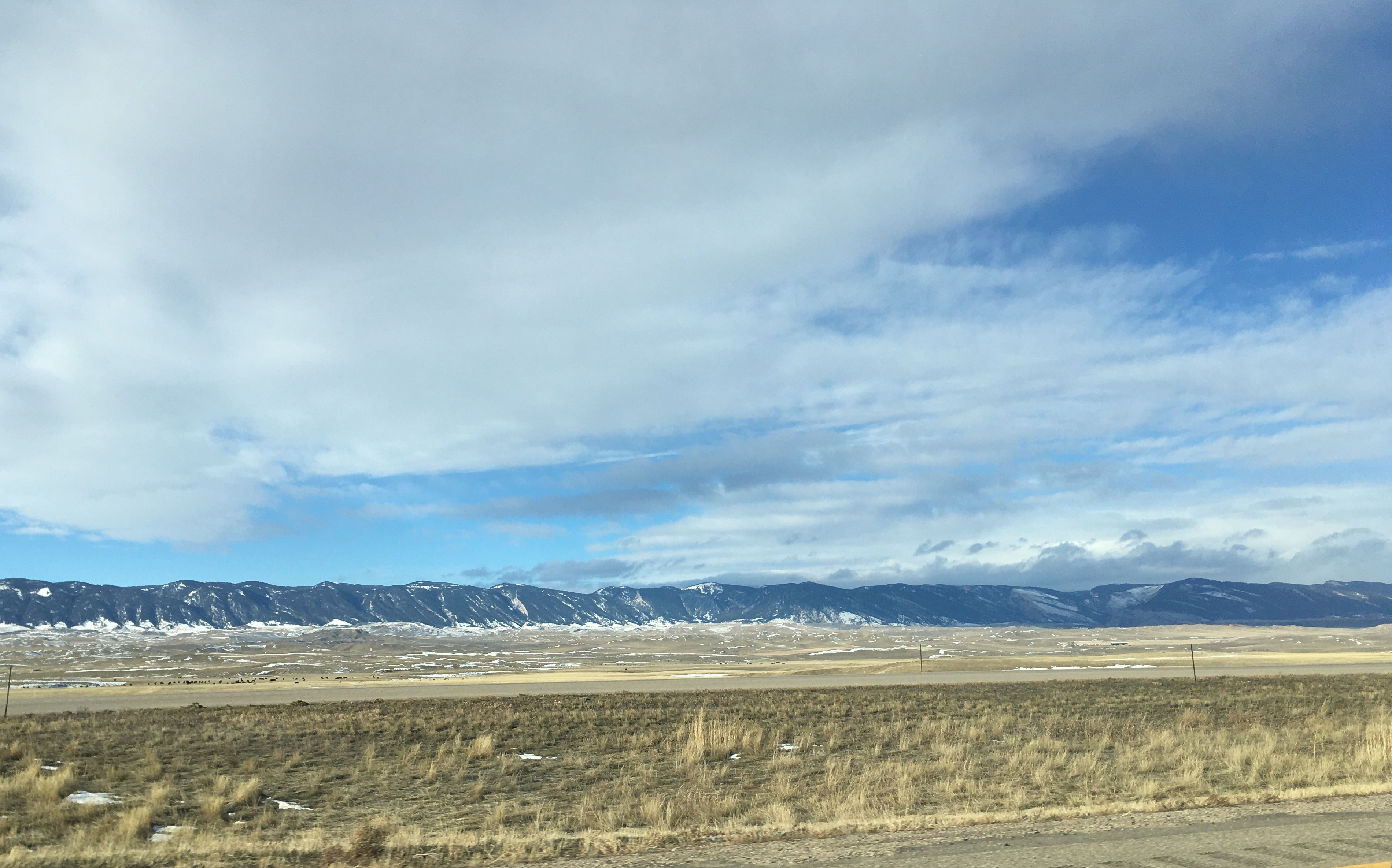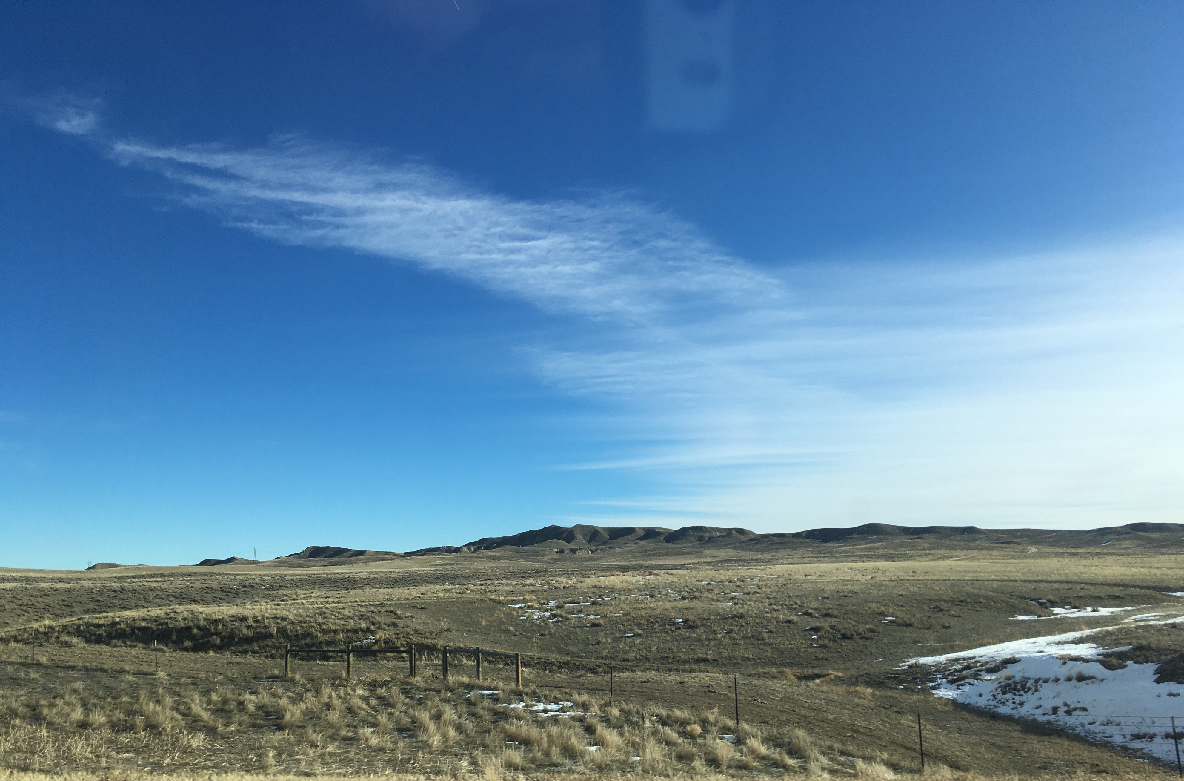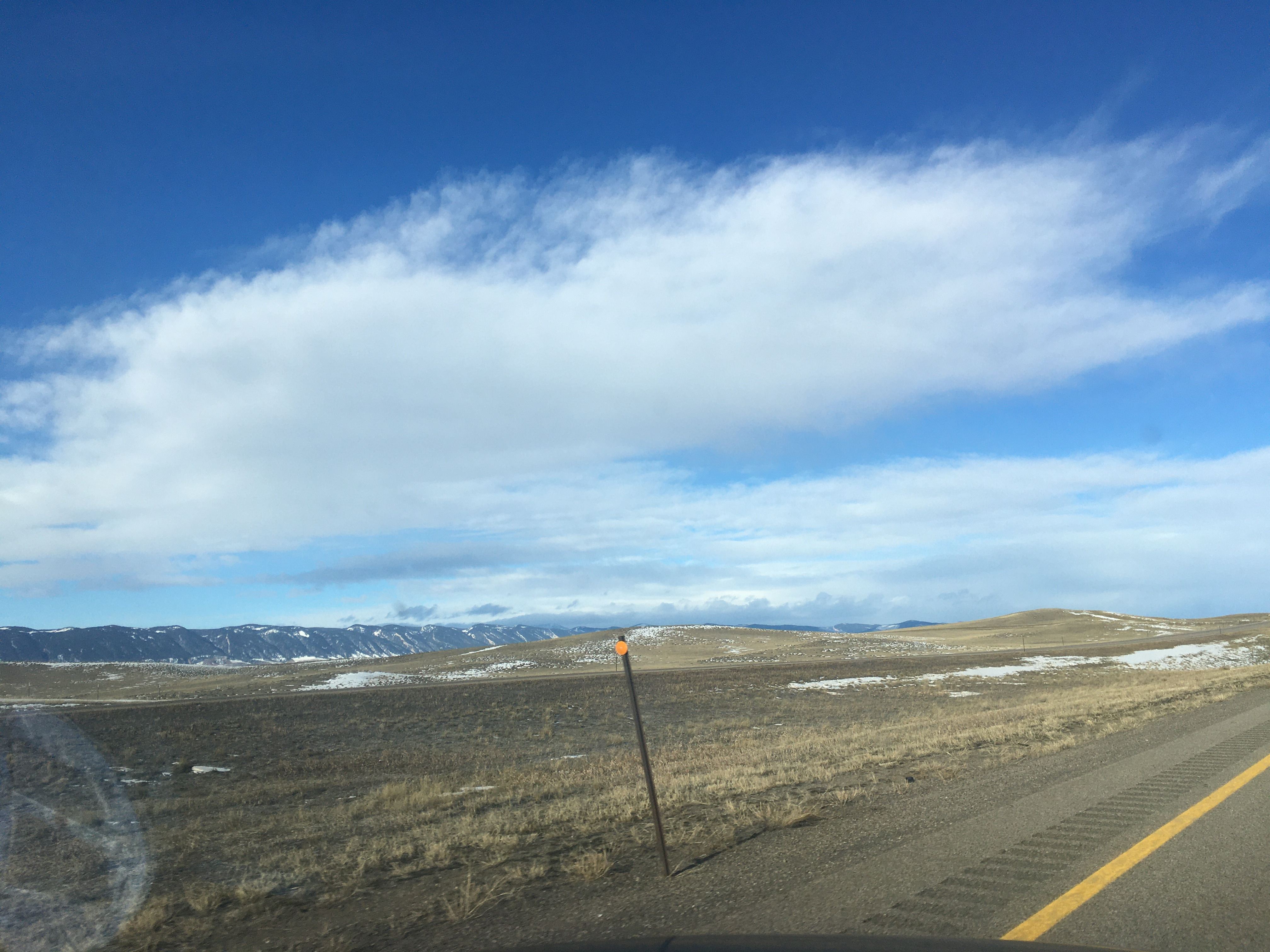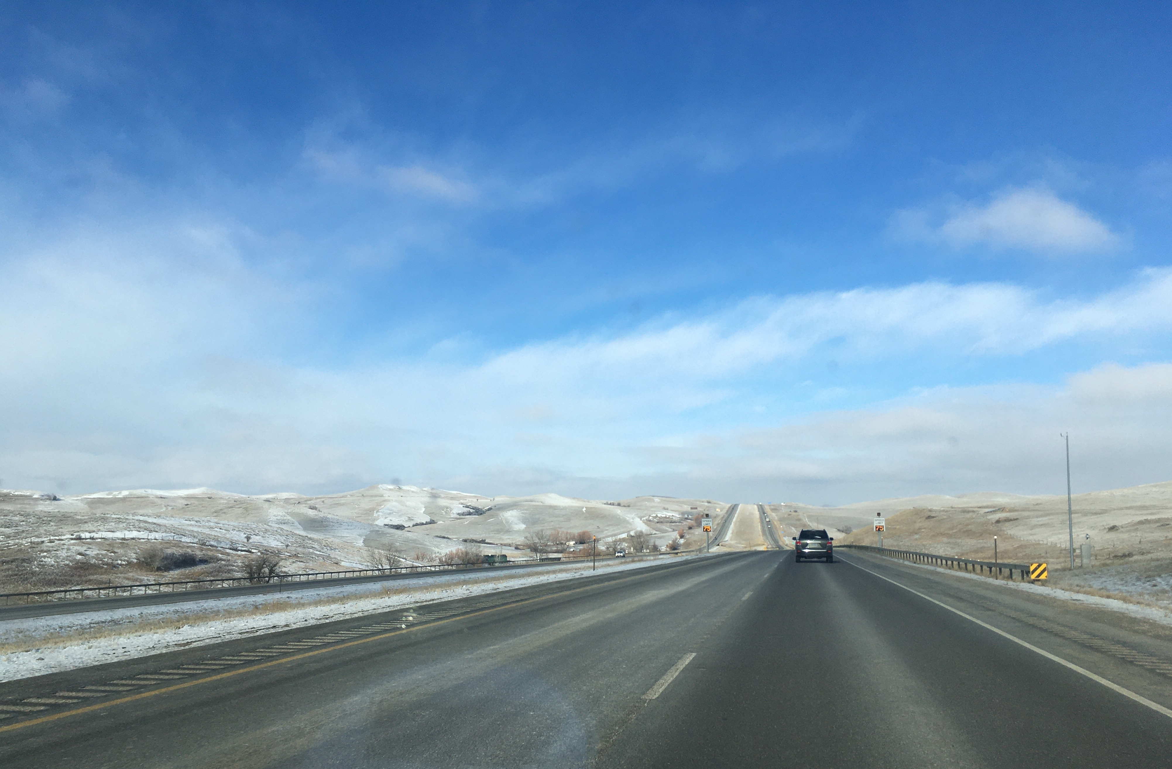 Hours have passed between those pics. See that long low dark lump in the second one? That's a mountain range, a big one, way off in the distance. First mountains you've seen for hours. At the very base of that thing is Casper Wyoming, and you turn 90º left to go around it and south to Cheyenne. Distances between towns are in the hundreds of miles sometimes.