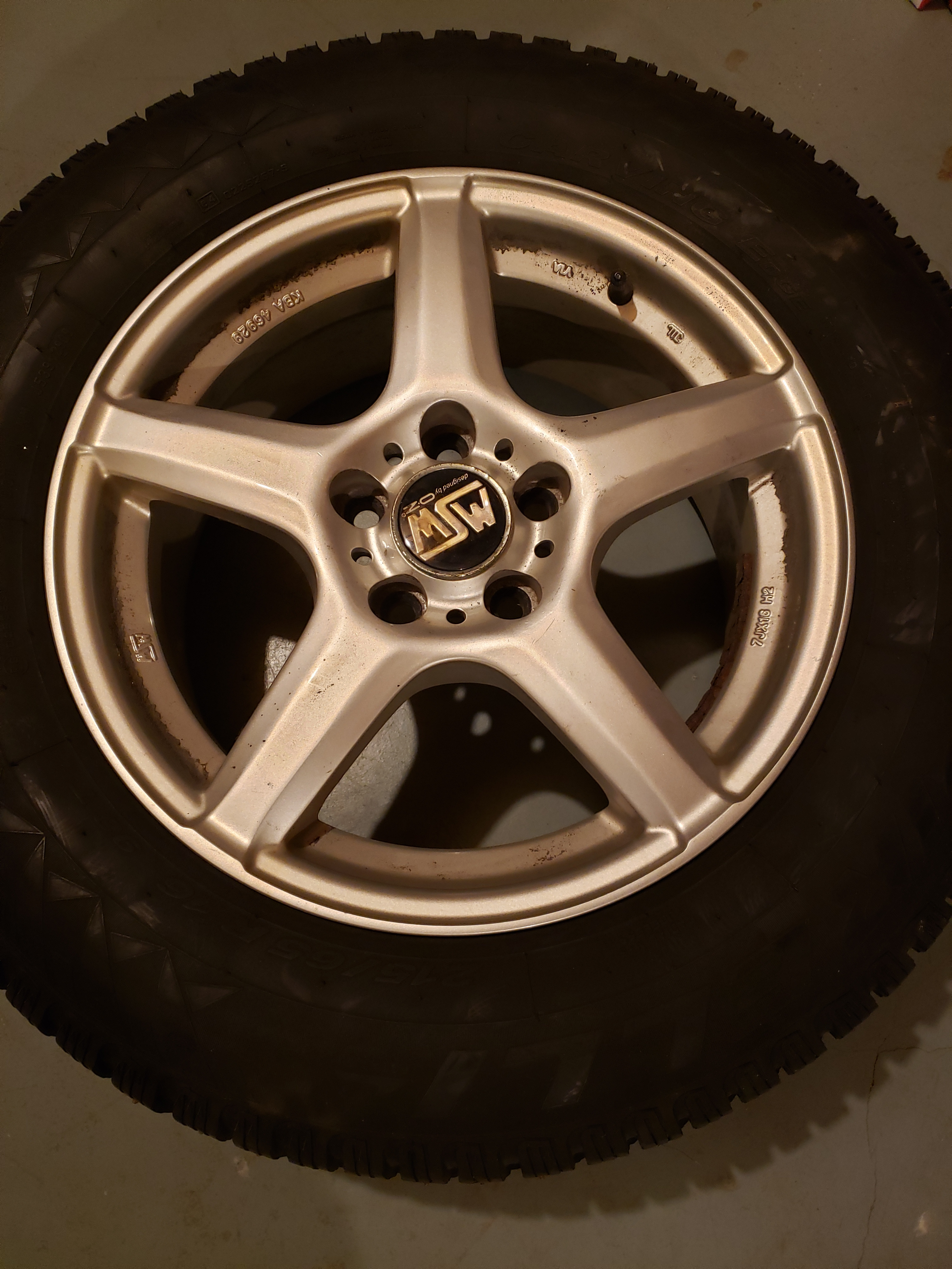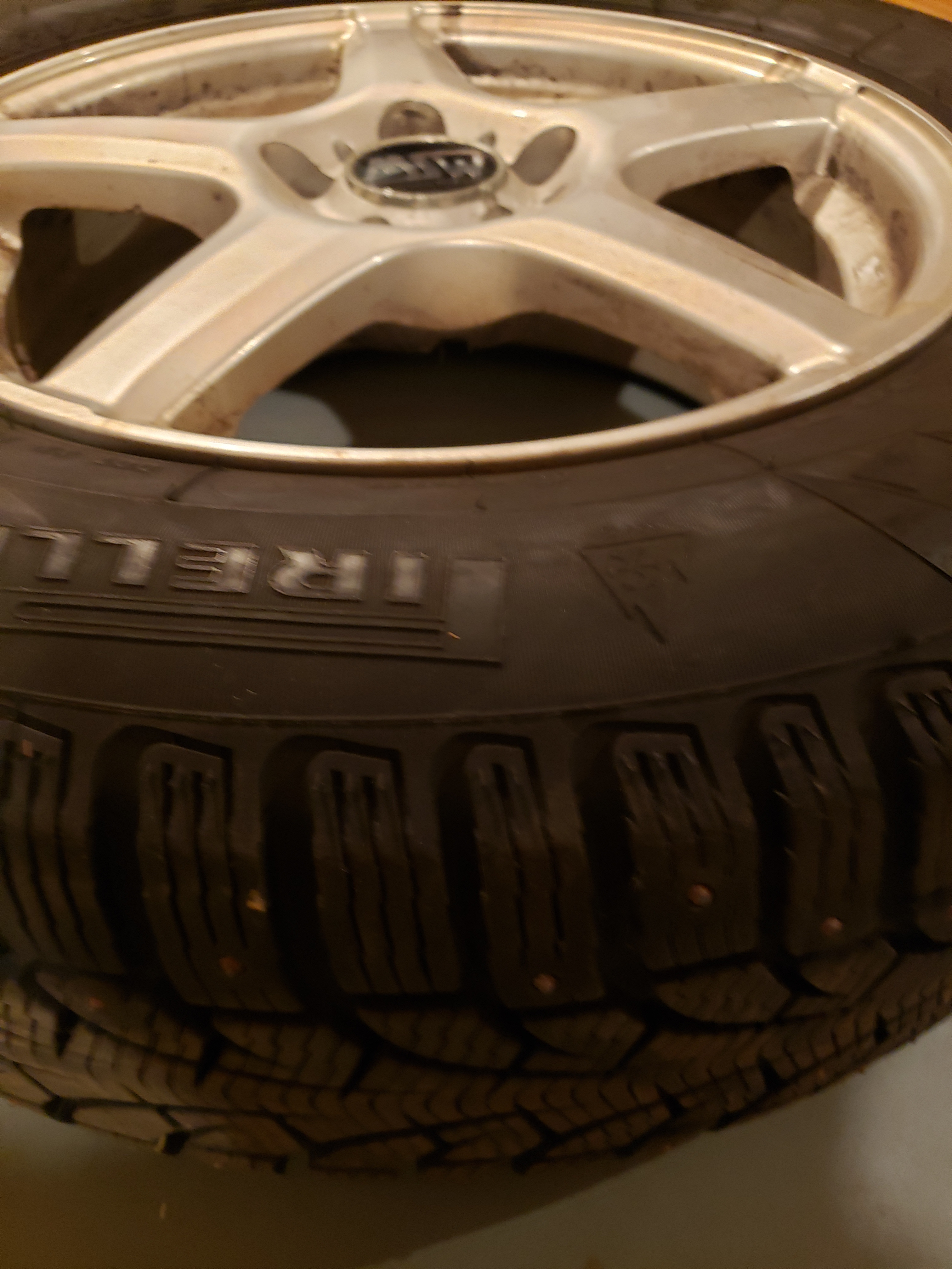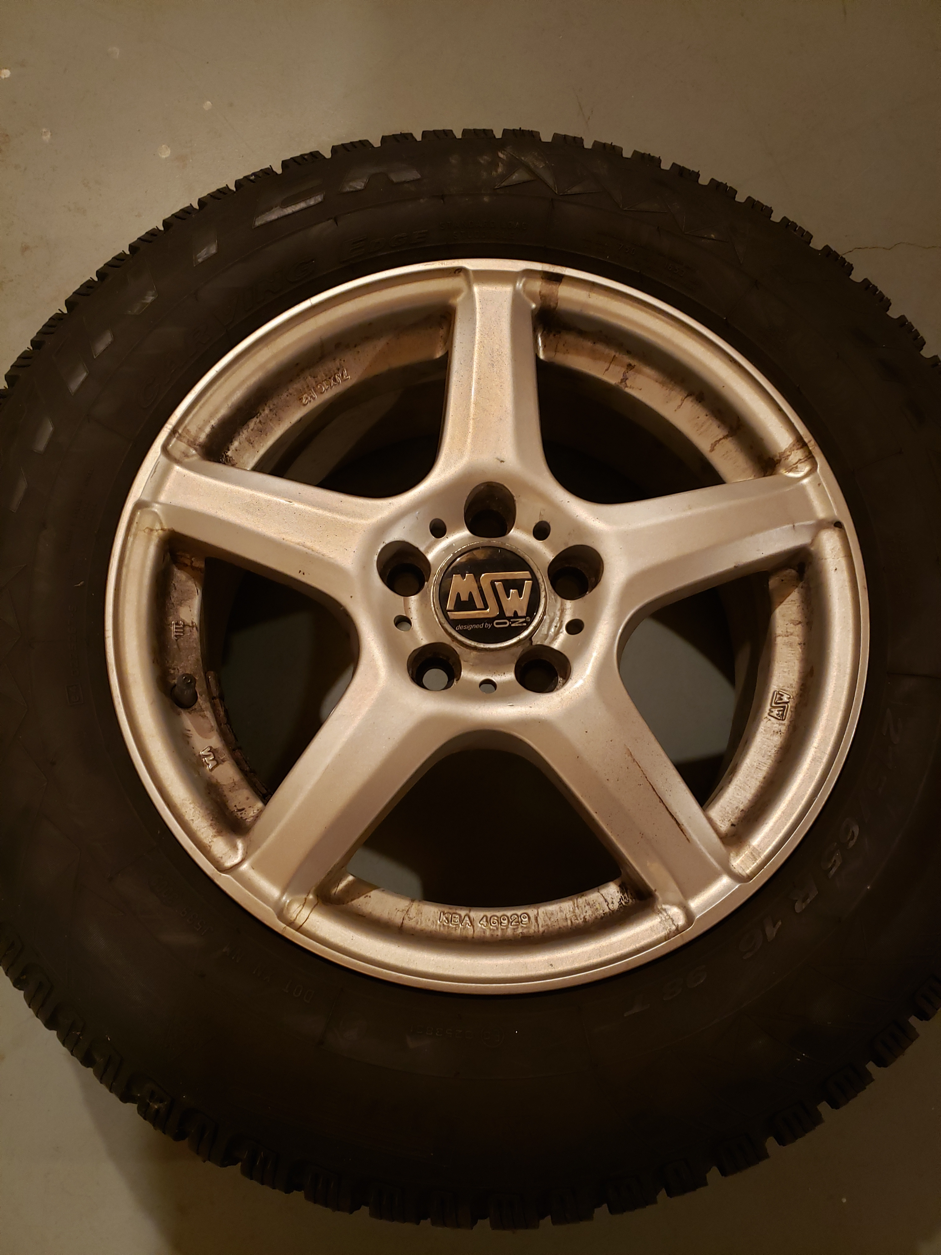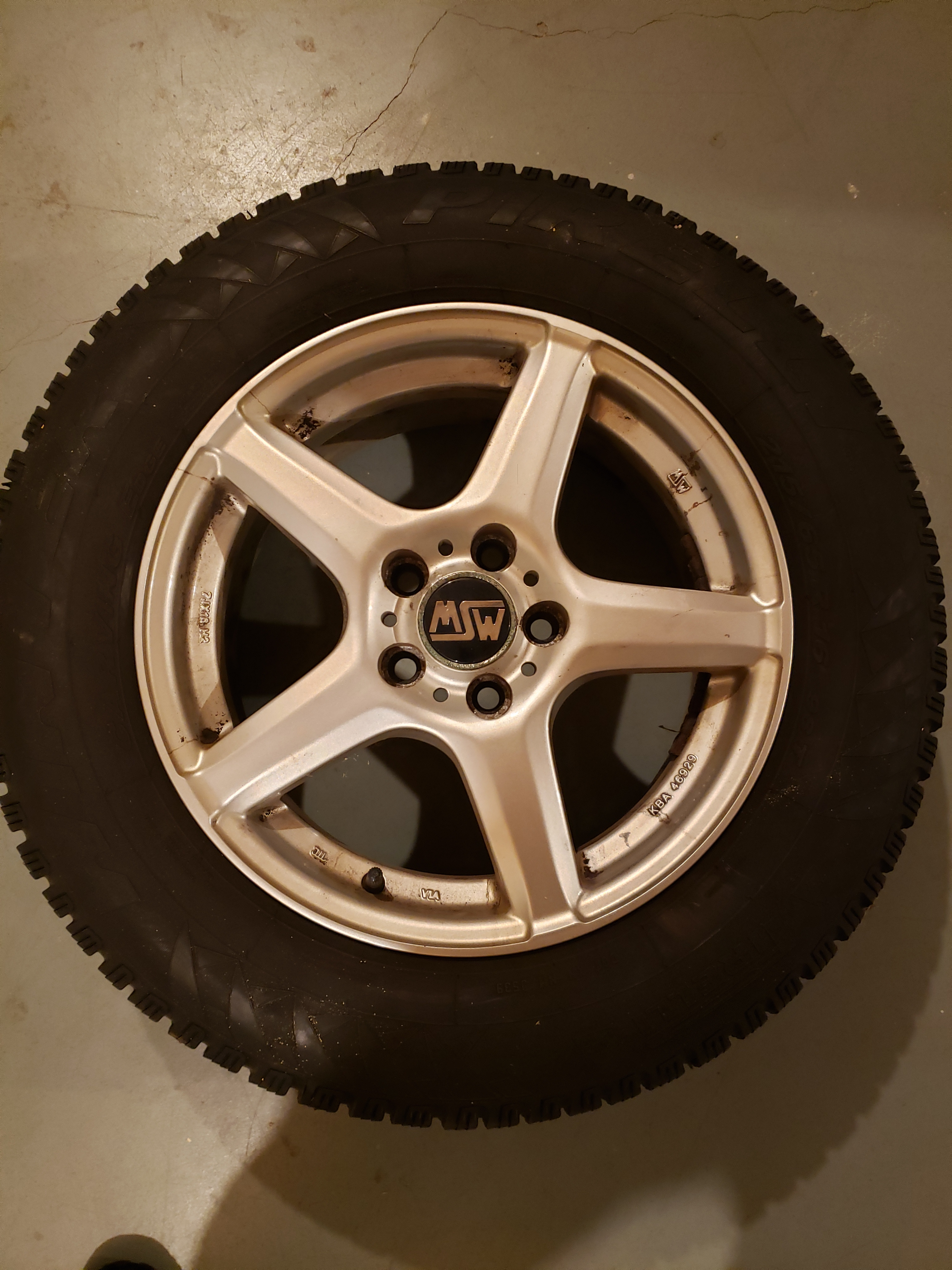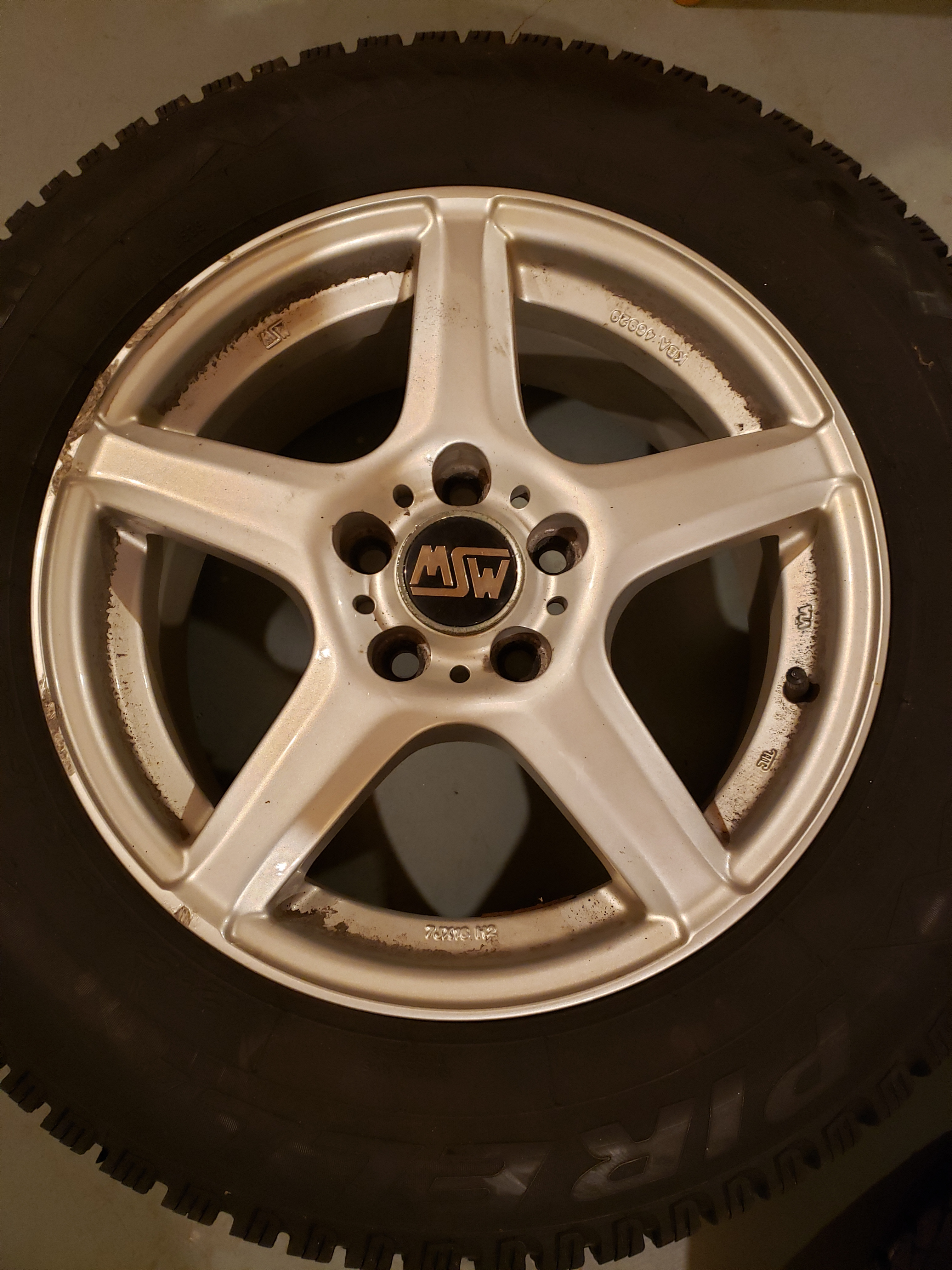 Four wheels mounted with 215/65 R16 Pirelli Winter Carving Edge studded snow tires. Plenty of great tread (7/32). No repairs. Mounted on MSW 7JX16 H2 alloy wheels (KBA 46929).